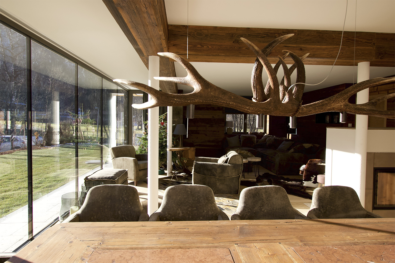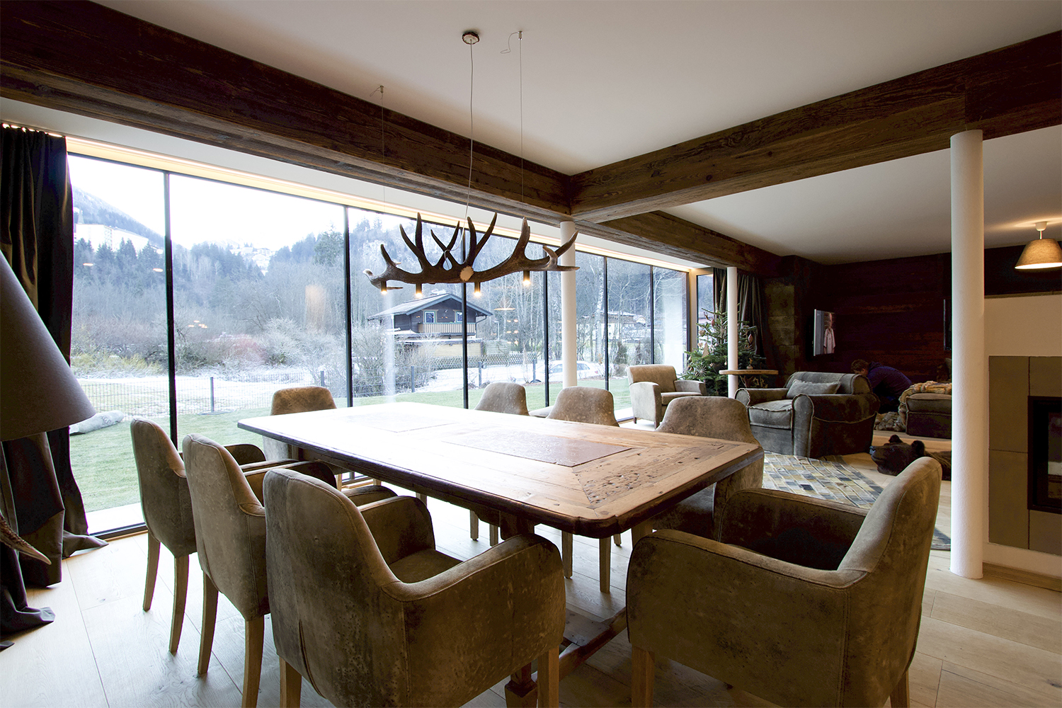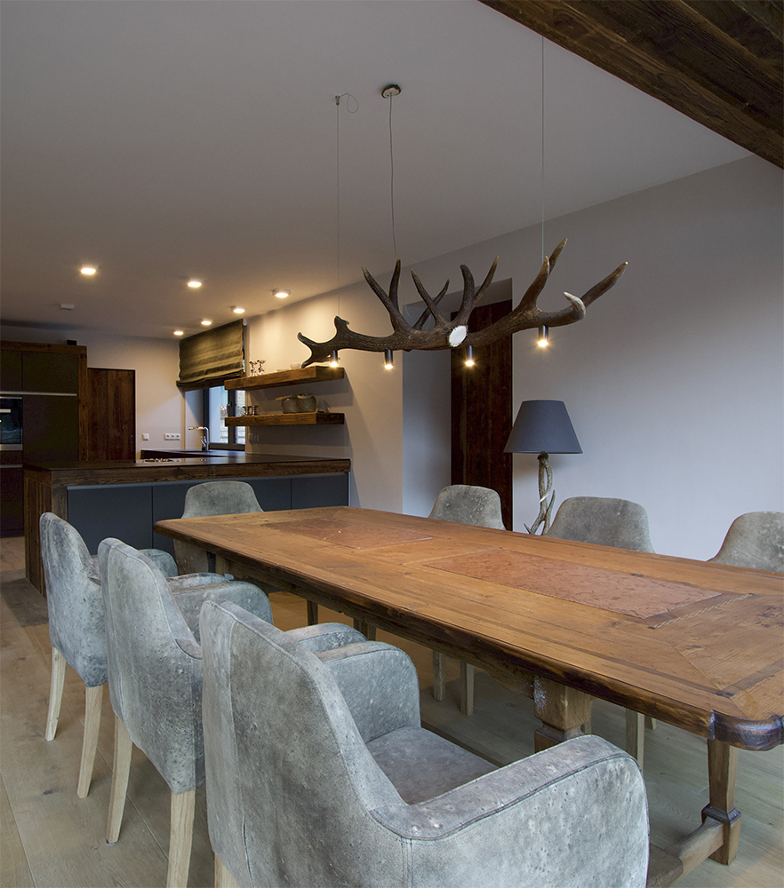 Cozy old oak dining table: The old oak dining table exudes rustic charm and provides an inviting place for meals. The chairs from Meindl with deer leather upholstery set accents and give the room a special touch.