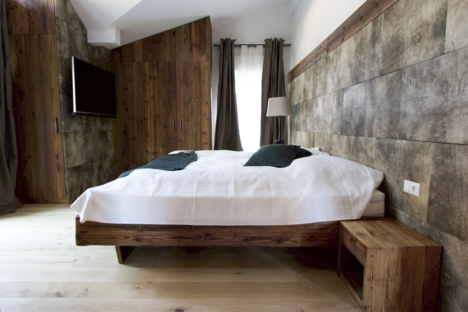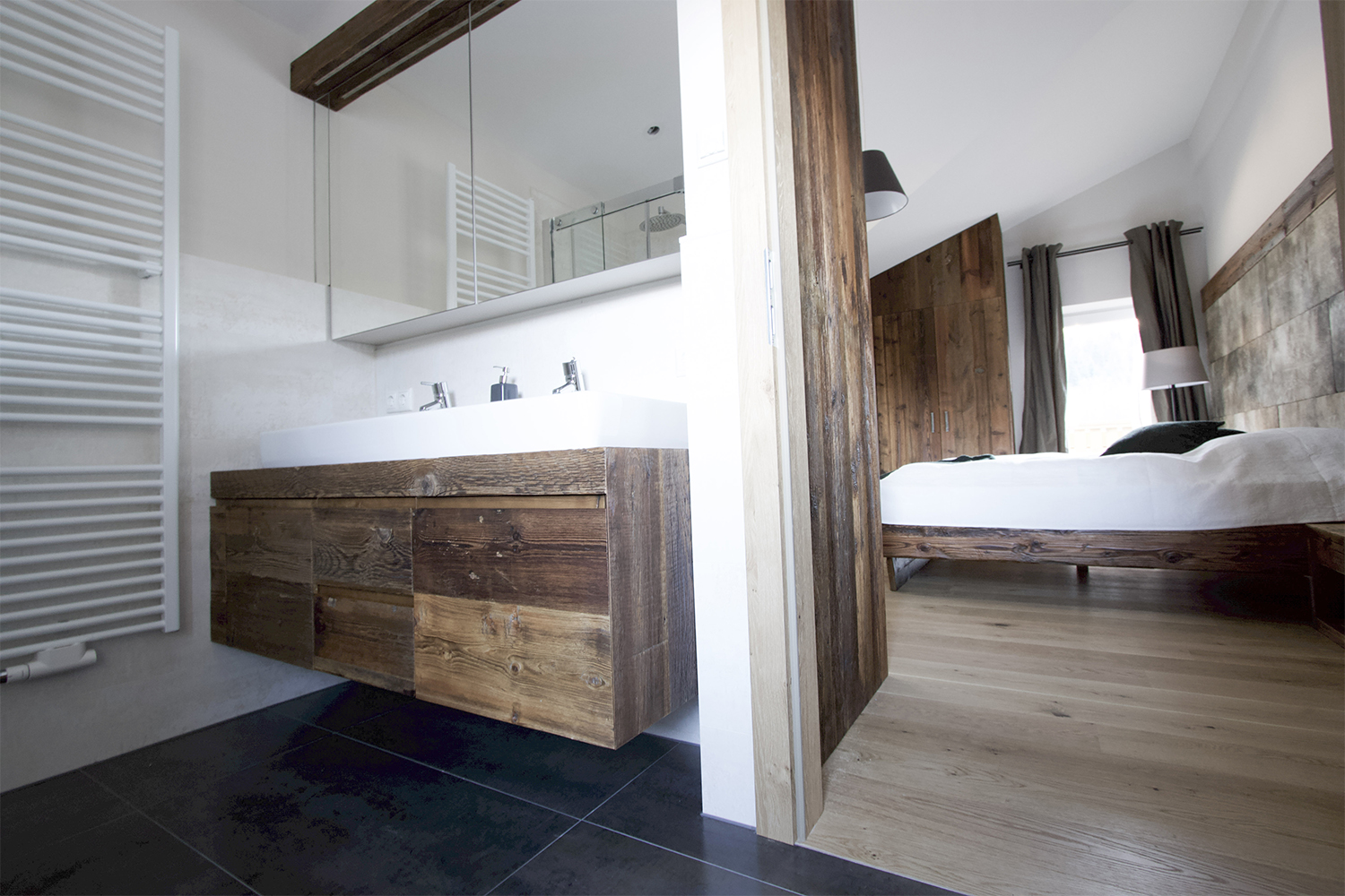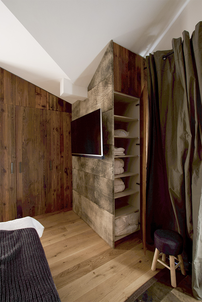 Bedroom: The bedheads are in Meindl deerskin and the beds and cupboards are in old wood. The homely style was also continued in the bathrooms.