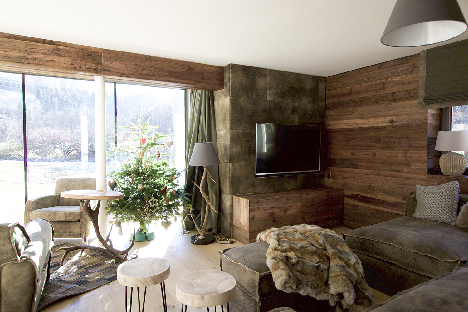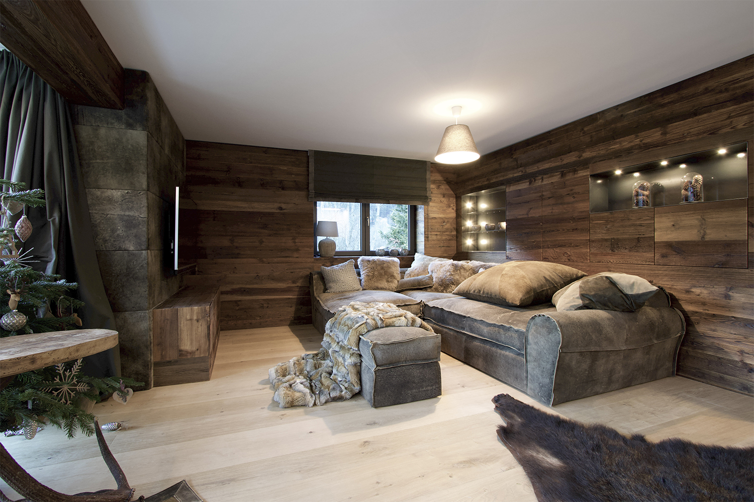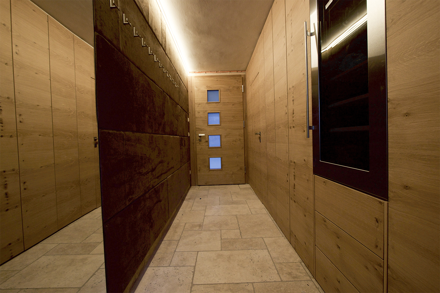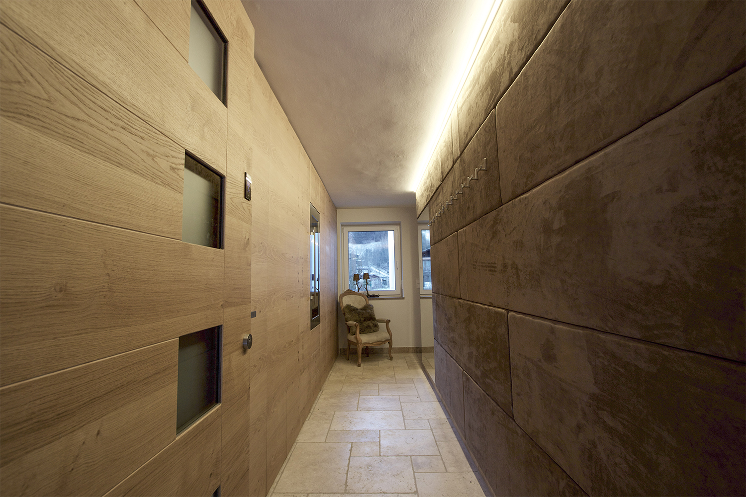 Anteroom with wall cladding: The entrance area was completely clad with deerskin from Meindl and is an eye-catcher as soon as you enter.