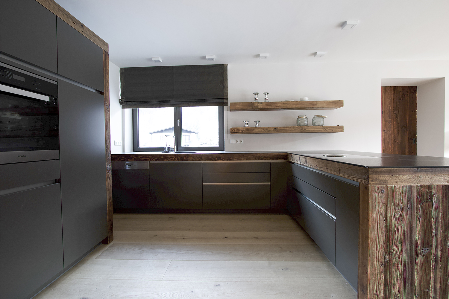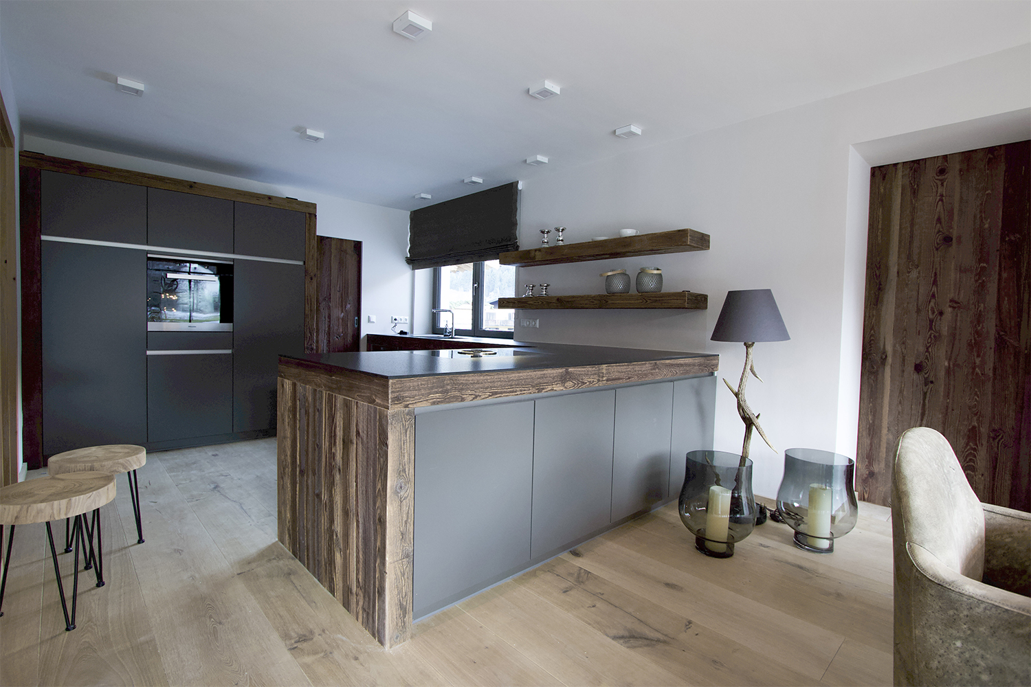 Modern kitchen in anthracite gray: The kitchen impresses with its elegant fronts in anthracite gray and a reclaimed wood frame. The compartments on the white wall offer additional storage space. The granite worktop in Nero Assoluto and the Bora hob complete this modern country house kitchen. away