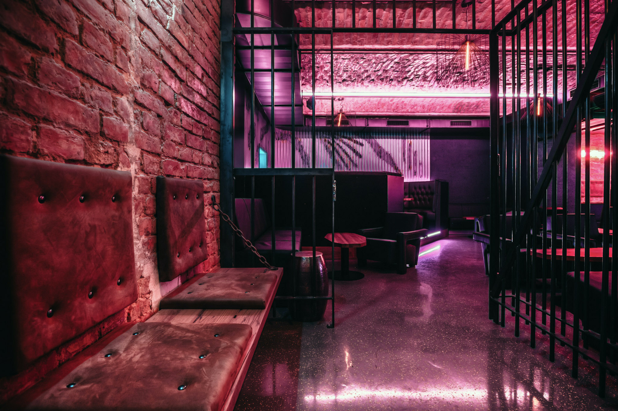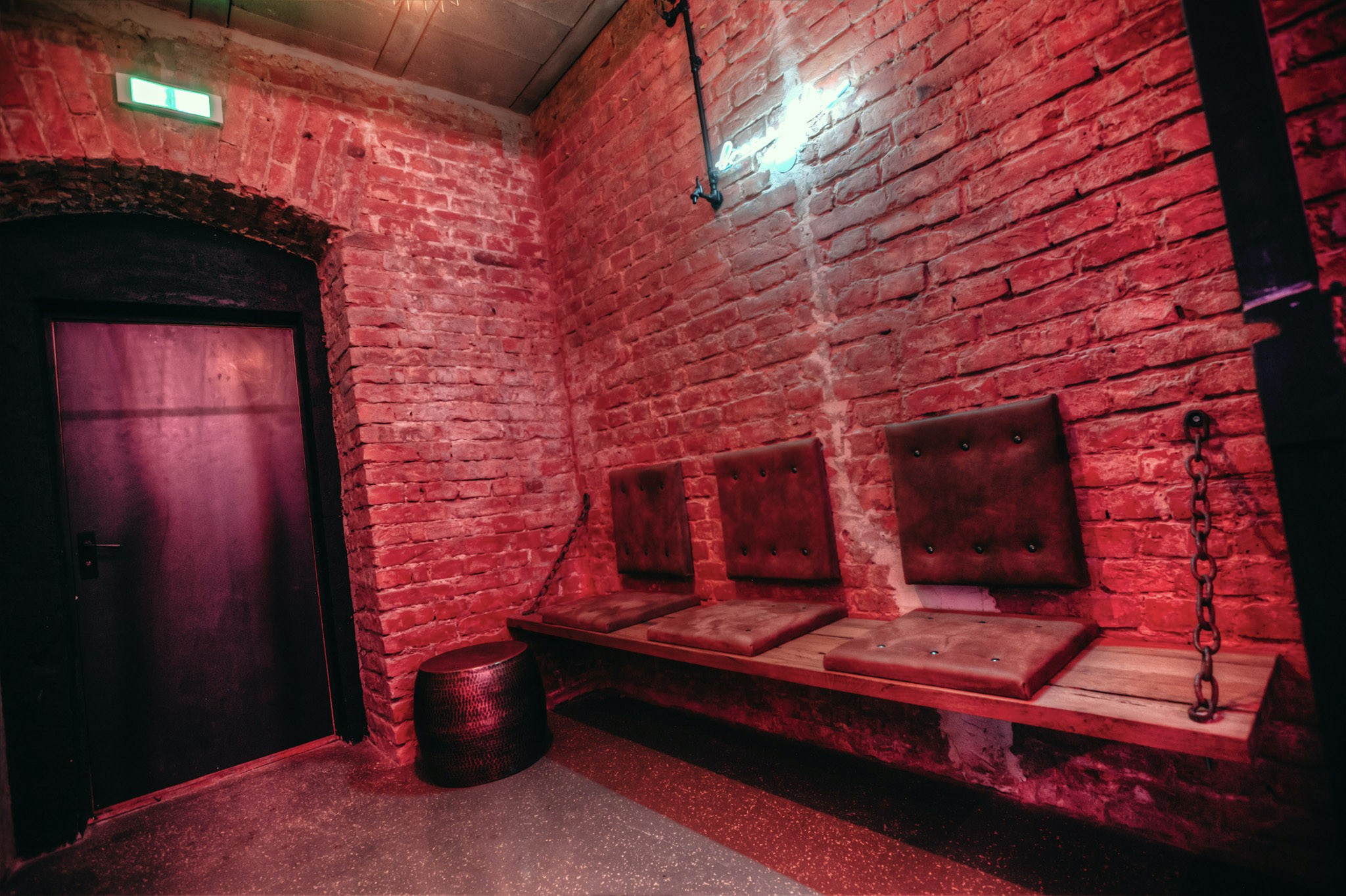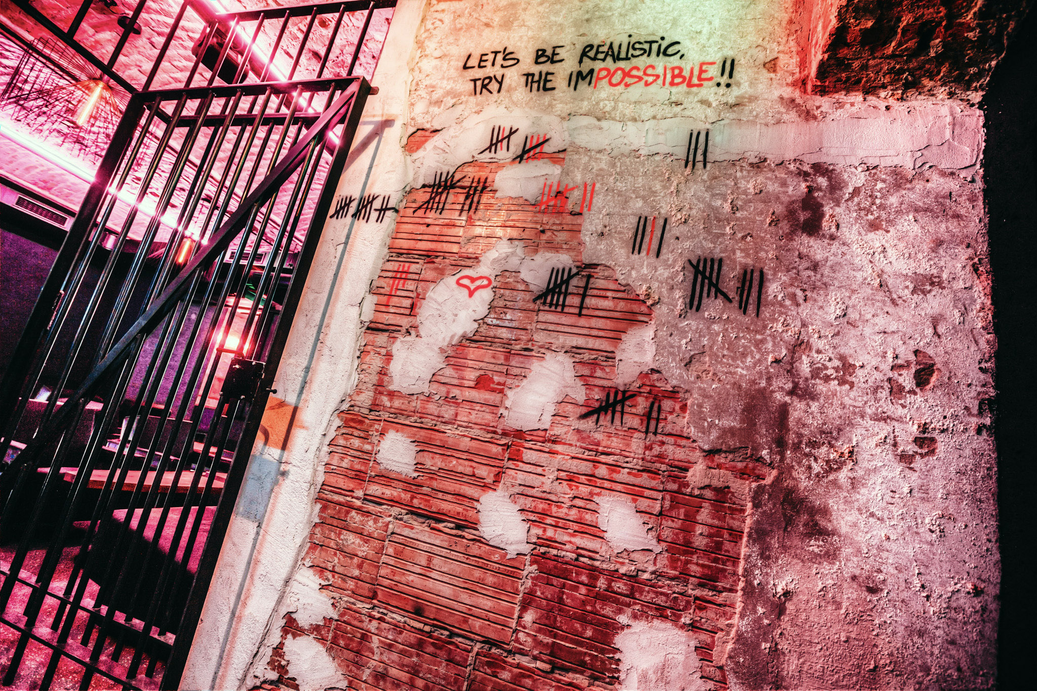 Unser Designkonzept basiert auf der Faszination für das Ambiente eines Gefängnisses. Mit hochwertigen Materialien wie Wildeiche, Eisengitter, Rohstahl und Leder haben wir eine Umgebung geschaffen, die sowohl rau als auch einladend wirkt. Die gemauerten Wände verleihen dem Raum eine robuste und authentische Note.