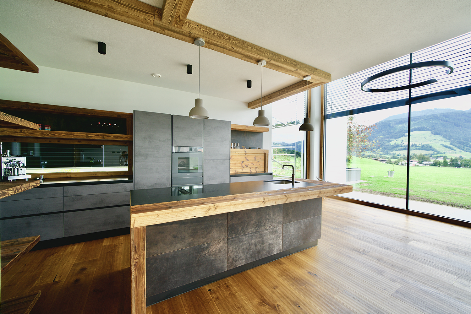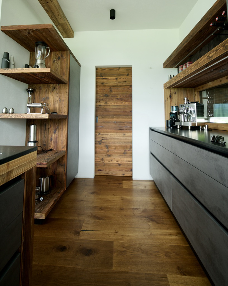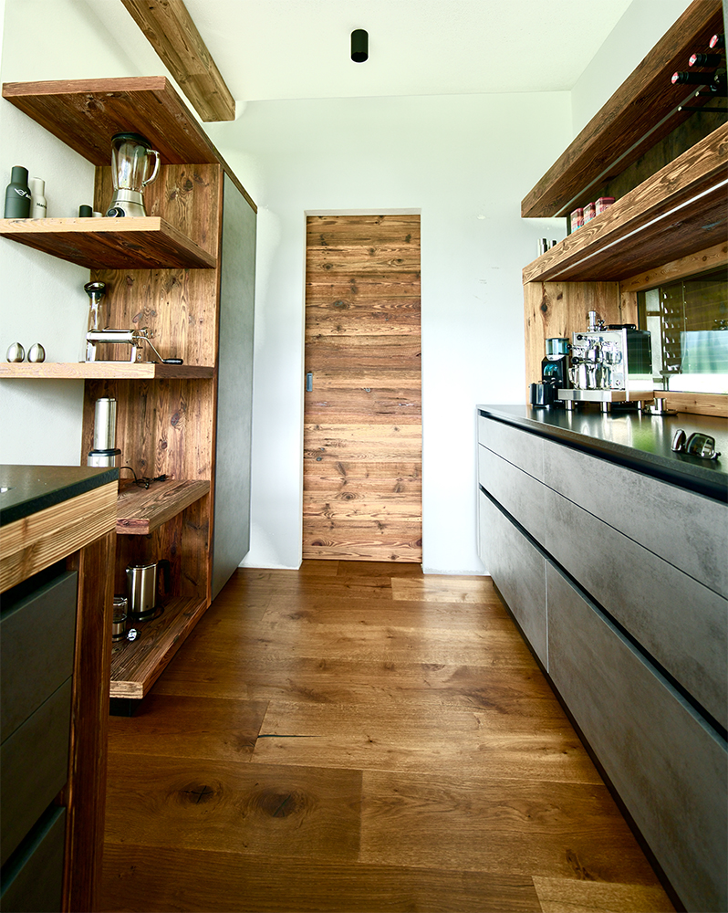 Der Boden im gesamten Haus ist mit geölter Wildeiche verlegt, und in der Küche haben wir geschickt Altholz und Leder und Betonoptik kombiniert. Die Deckenbalken verleihen dem Raum eine warme Atmosphäre.