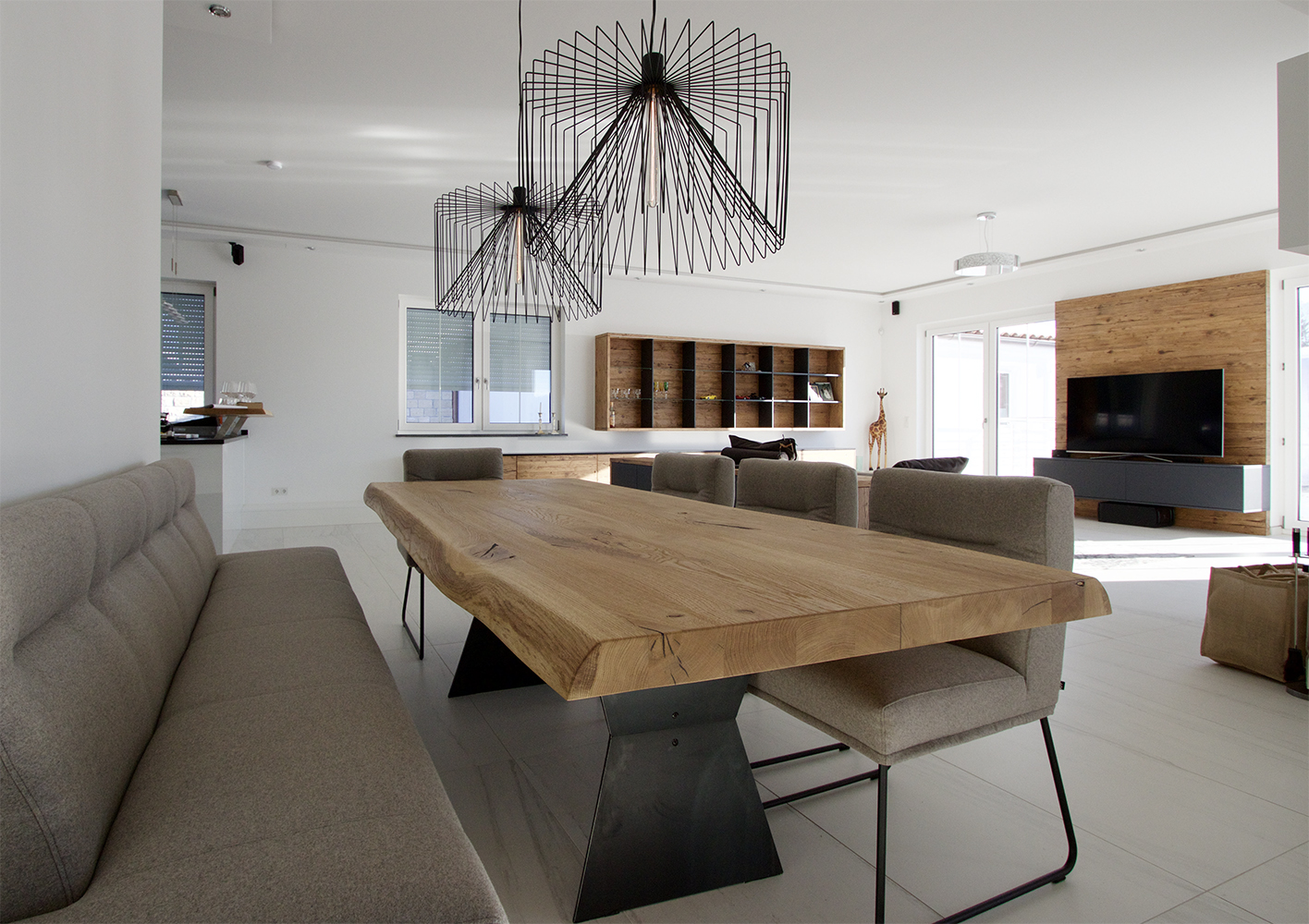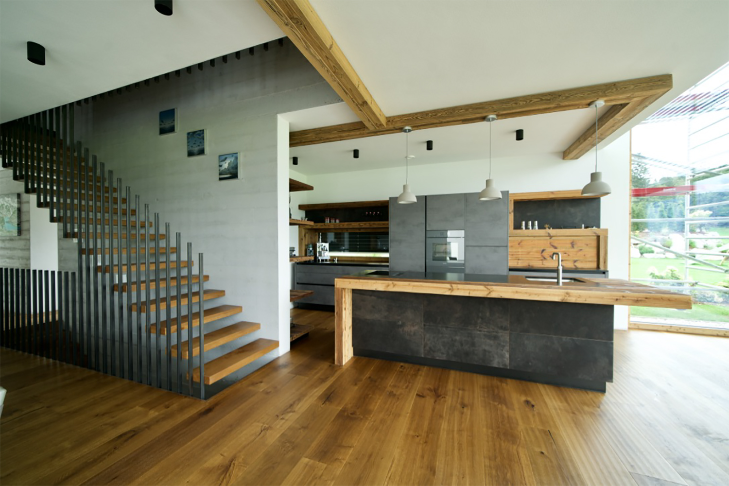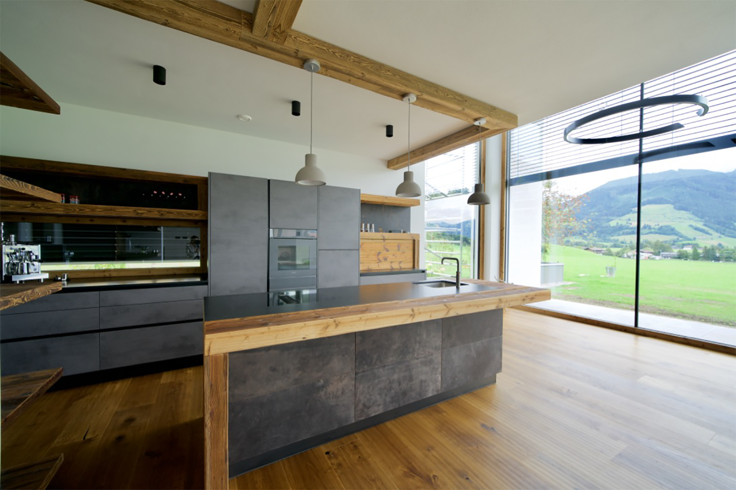 Der Boden im gesamten Haus ist mit geölter Wildeiche verlegt, und in der Küche haben wir geschickt Altholz und Leder und Betonoptik kombiniert. Die Deckenbalken verleihen dem Raum eine warme Atmosphäre.