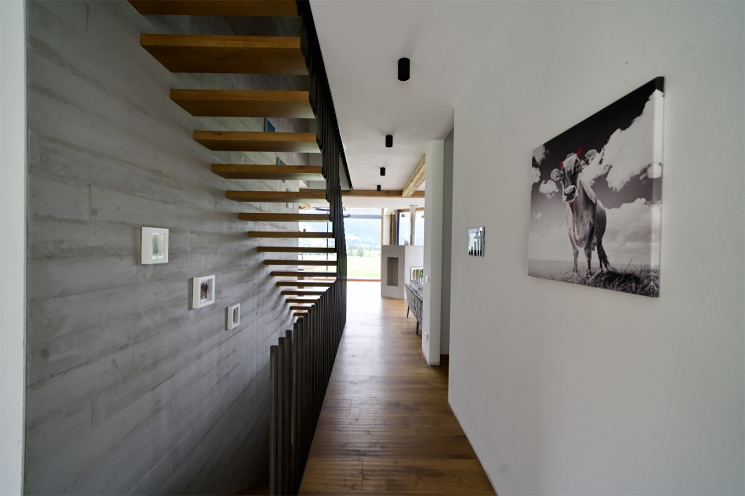 Die Küche überrascht mit einem Küchengeräte Stauraum mit Hochschwenkfront und im Wohnzimmer bildet der moderne Kaminofen das Herzstück. Das Stiegenhaus zeichnet sich durch eine Betonwand und ein extravagantes Geländer aus einzelnen Eisenstäben aus. Entdecken Sie die Kreativität und Liebe zum Detail in jedem Raum. Hier sind Design und Funktionalität perfekt vereint..