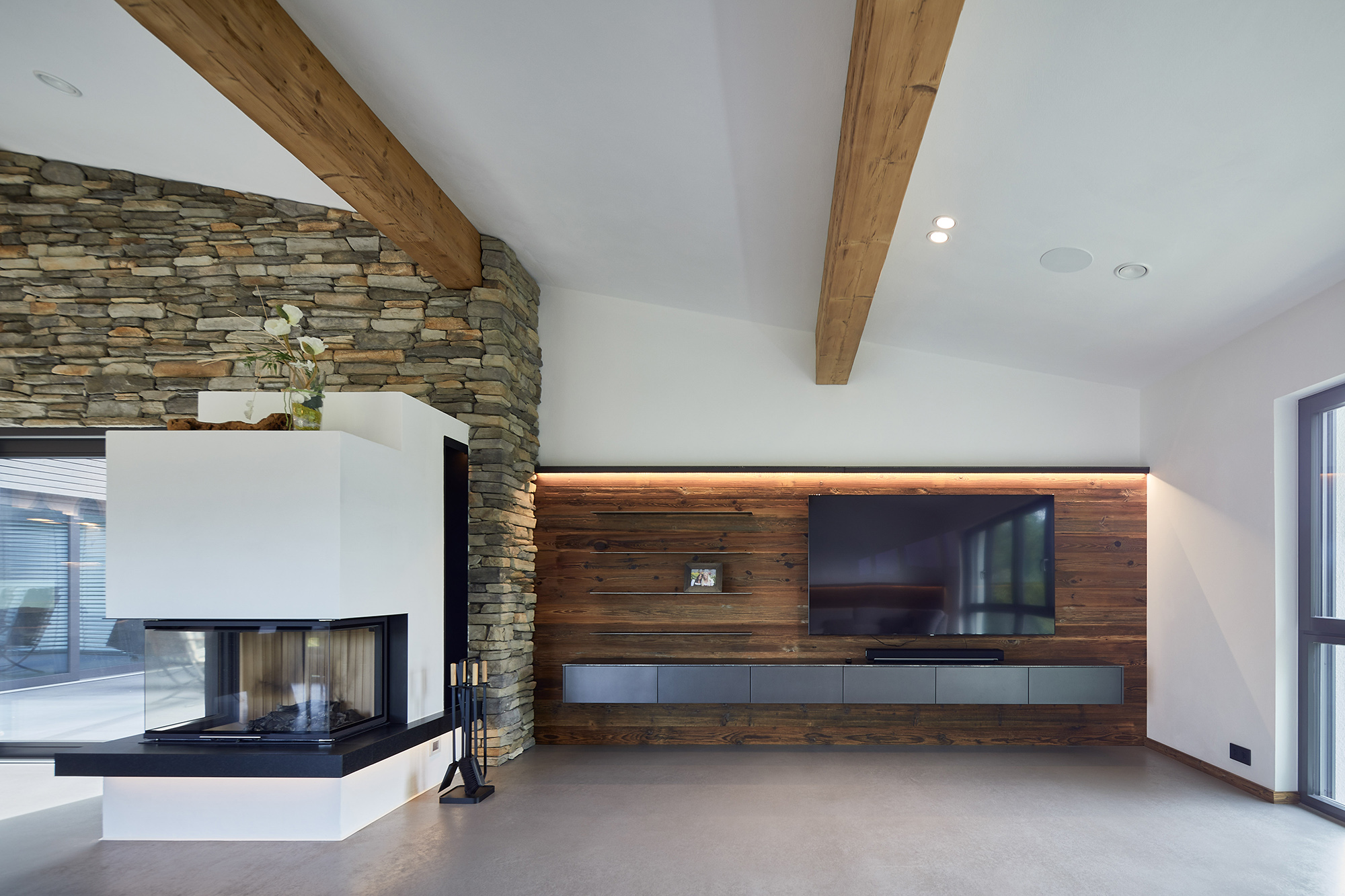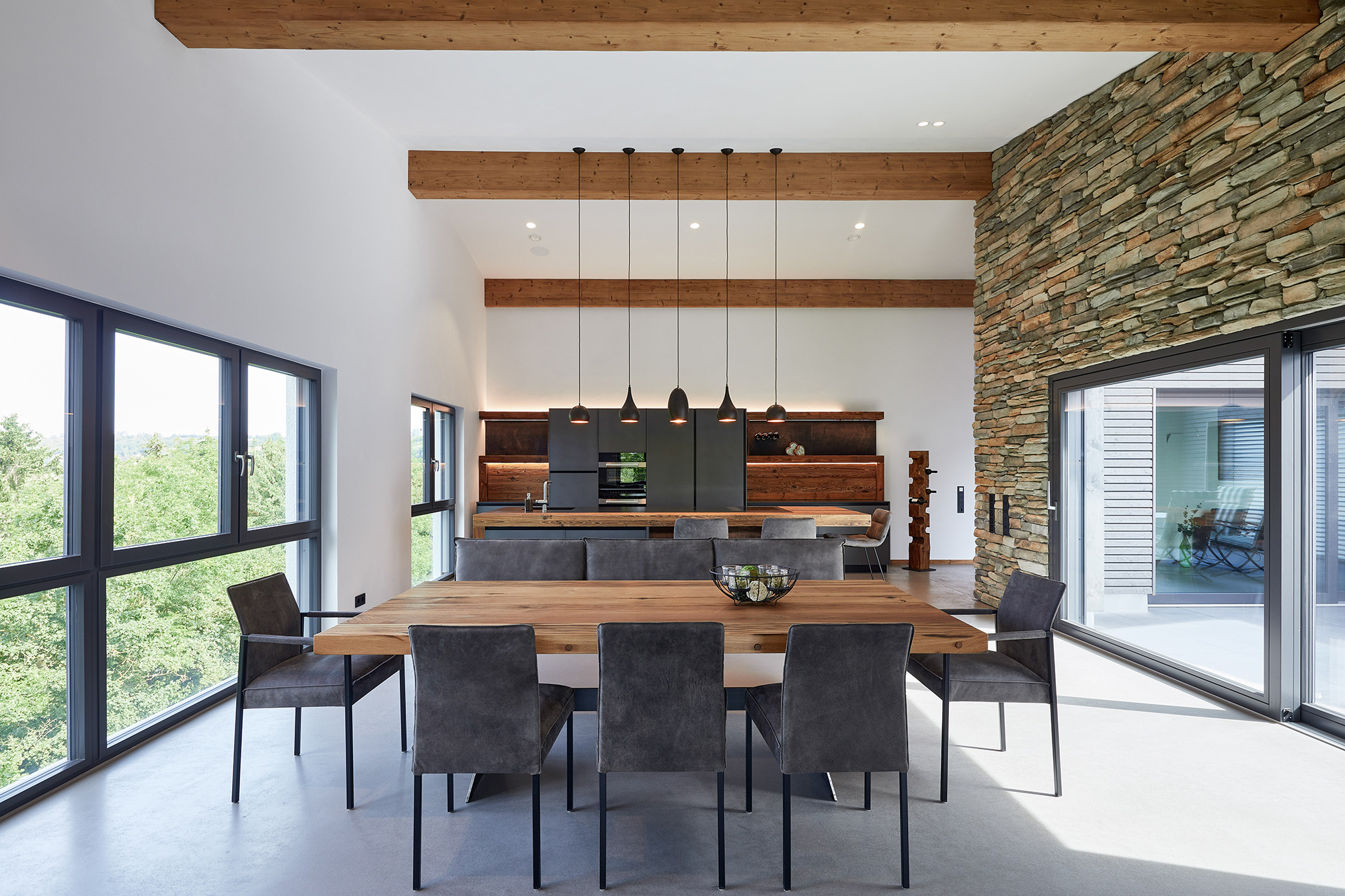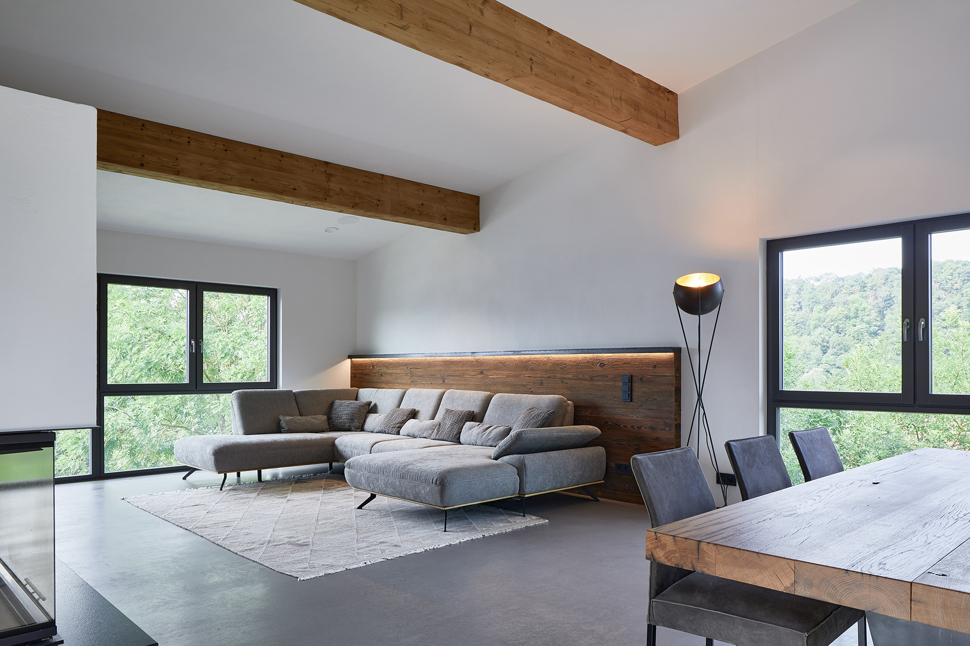 Im Wohnzimmer erwartet Sie ein stilvolles Sideboard und Rohstahlfächer auf einer Altholzrückwand. Eine gemütliche Couch vor eine Rückwand lädt zum Entspannen ein, während indirekte Beleuchtung eine warme Atmosphäre schaffen. Der Esstisch aus vollmassiver alter Eiche thront auf einem robusten Rohstahlgestell und bildet einen imposanten Mittelpunkt. Passend dazu sind die Stühle in Vintage-Leder, farblich abgestimmt auf die Couch. Der Betonboden verleiht dem gesamten Haus einen modernen, loftartigen Charakter.