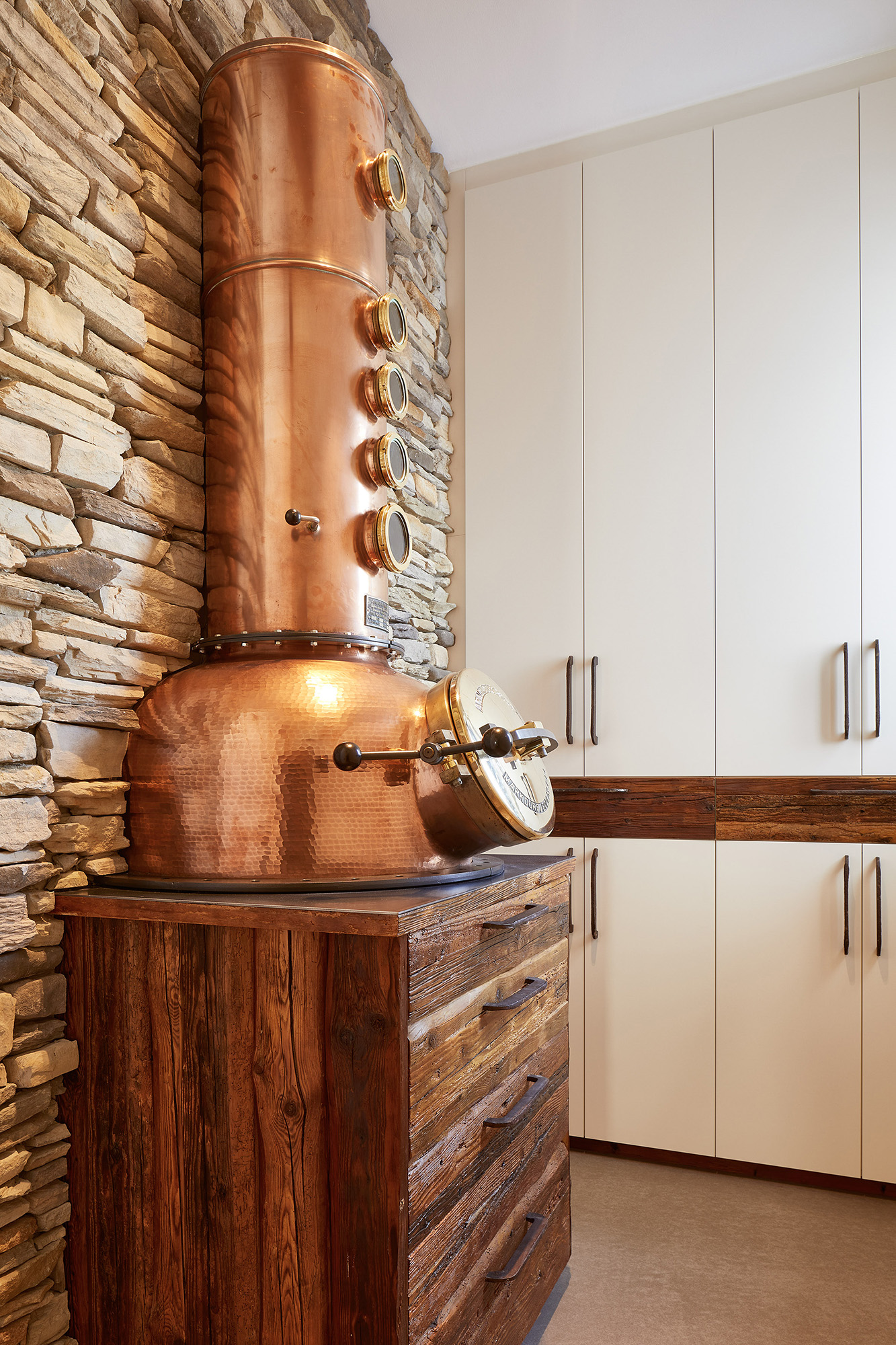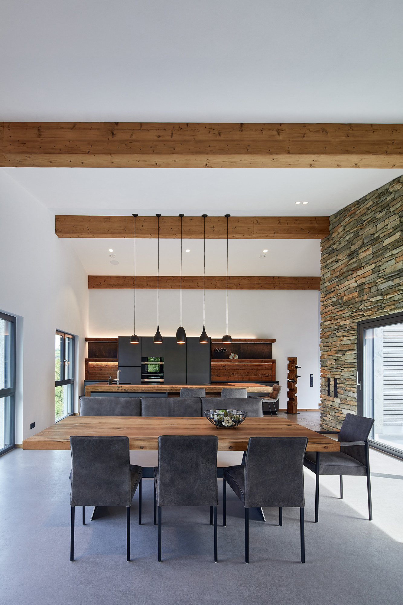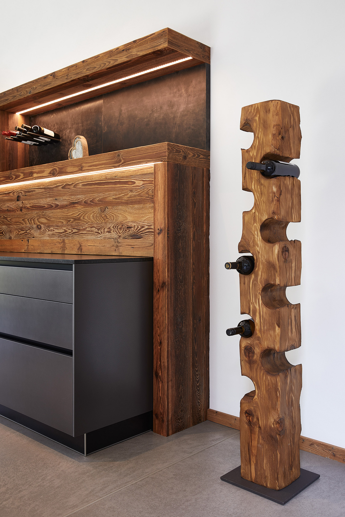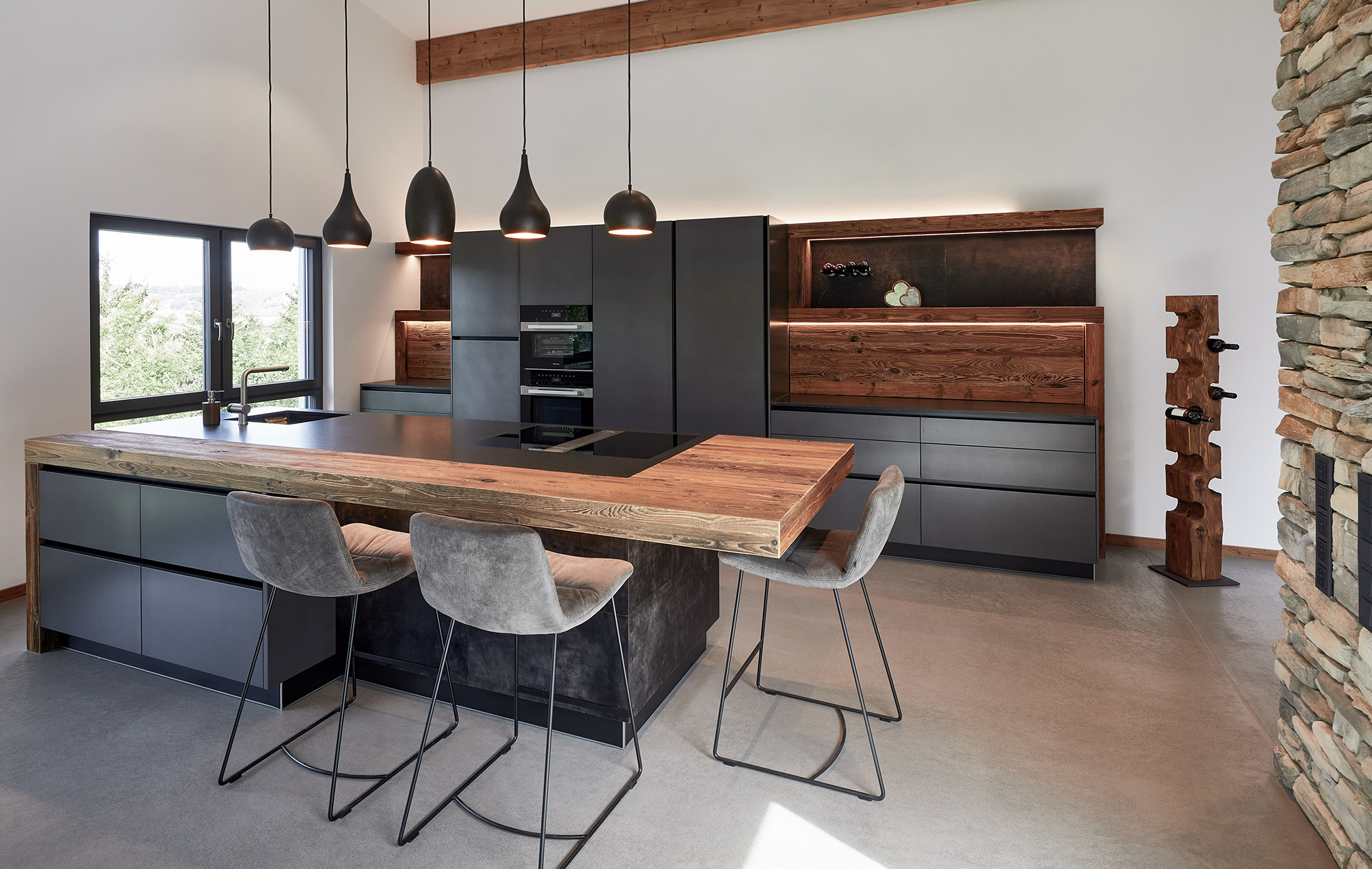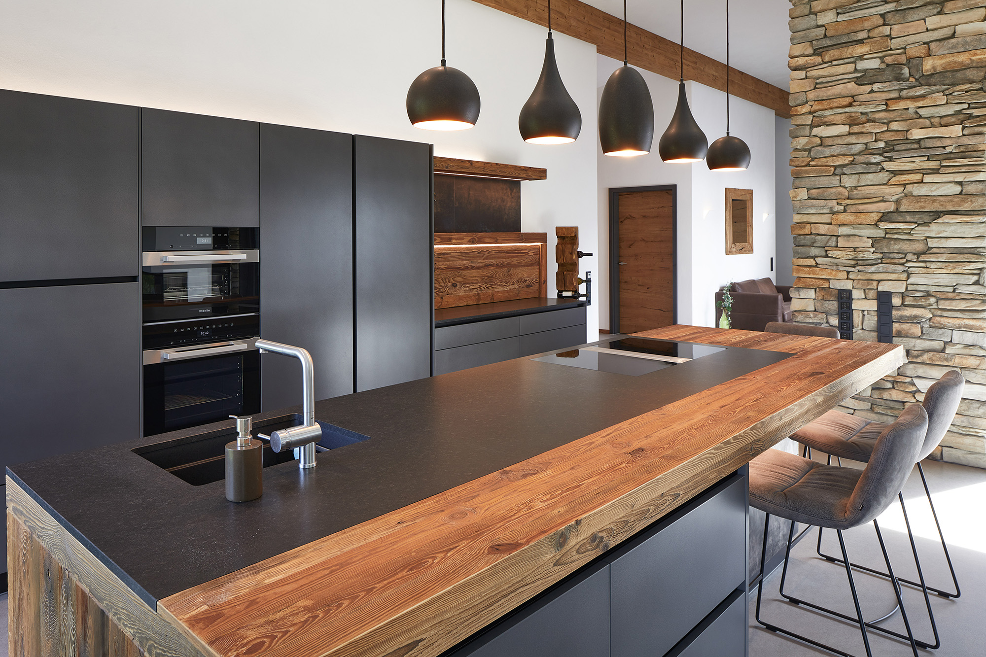 Unsere Küche ist ein Meisterwerk des Designs mit ihren edlen grauen Fronten, die einen stilvollen Kontrast zur Umgebung schaffen. Die Inselrückseite und die Rückwand sind kunstvoll mit grauem Büffelleder verkleidet. Die Bar aus Altholz ist nicht nur ein Blickfang, sondern birgt auch eine zusätzliche Arbeitsfläche. Die Rückwand in Altholz verbirg dahinter die Gerätegarage. Der hoch eingebaute Geschirrspüler sorgt für nahtlose Ästhetik, während die Steinwand rustikalen Charme verströmt.