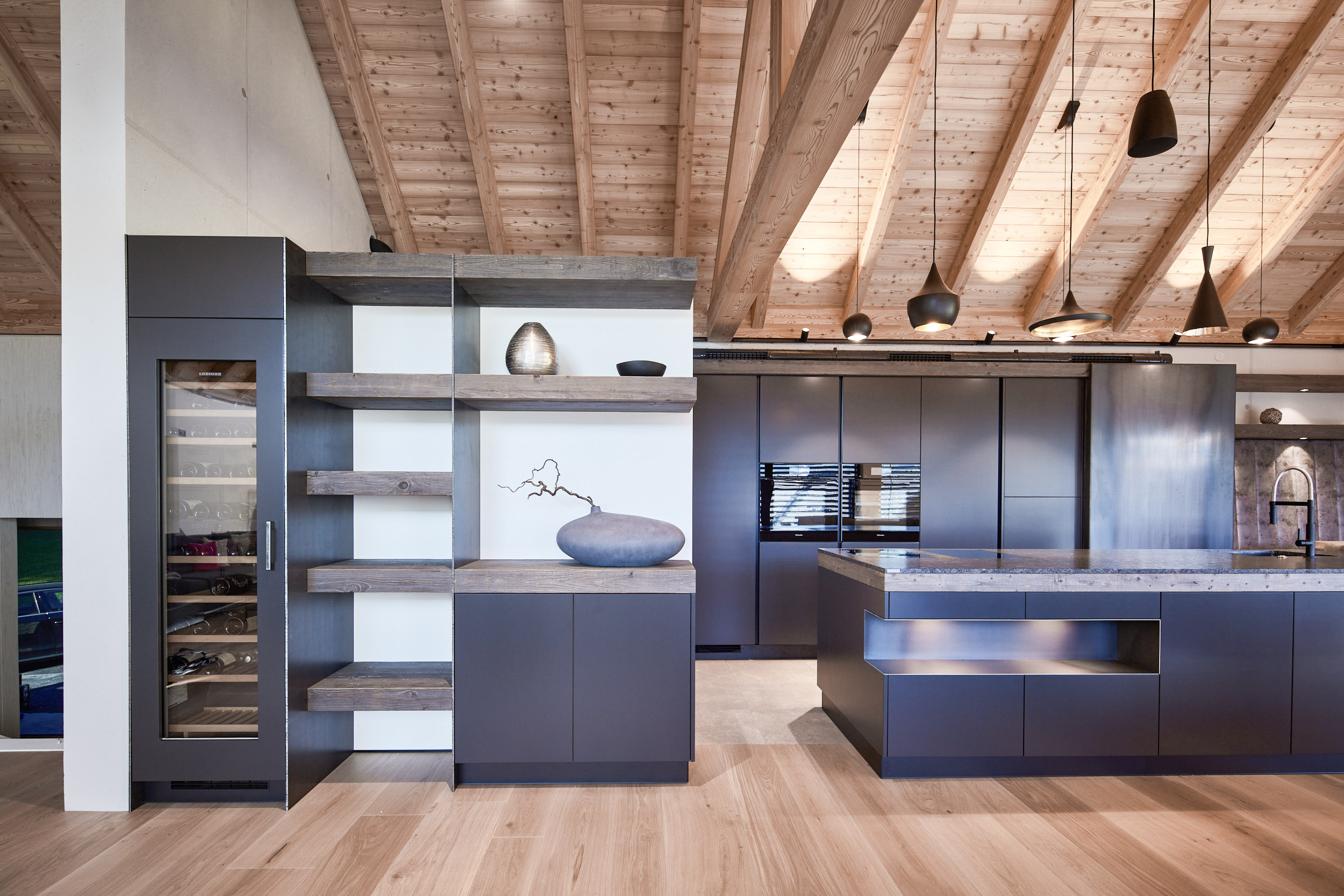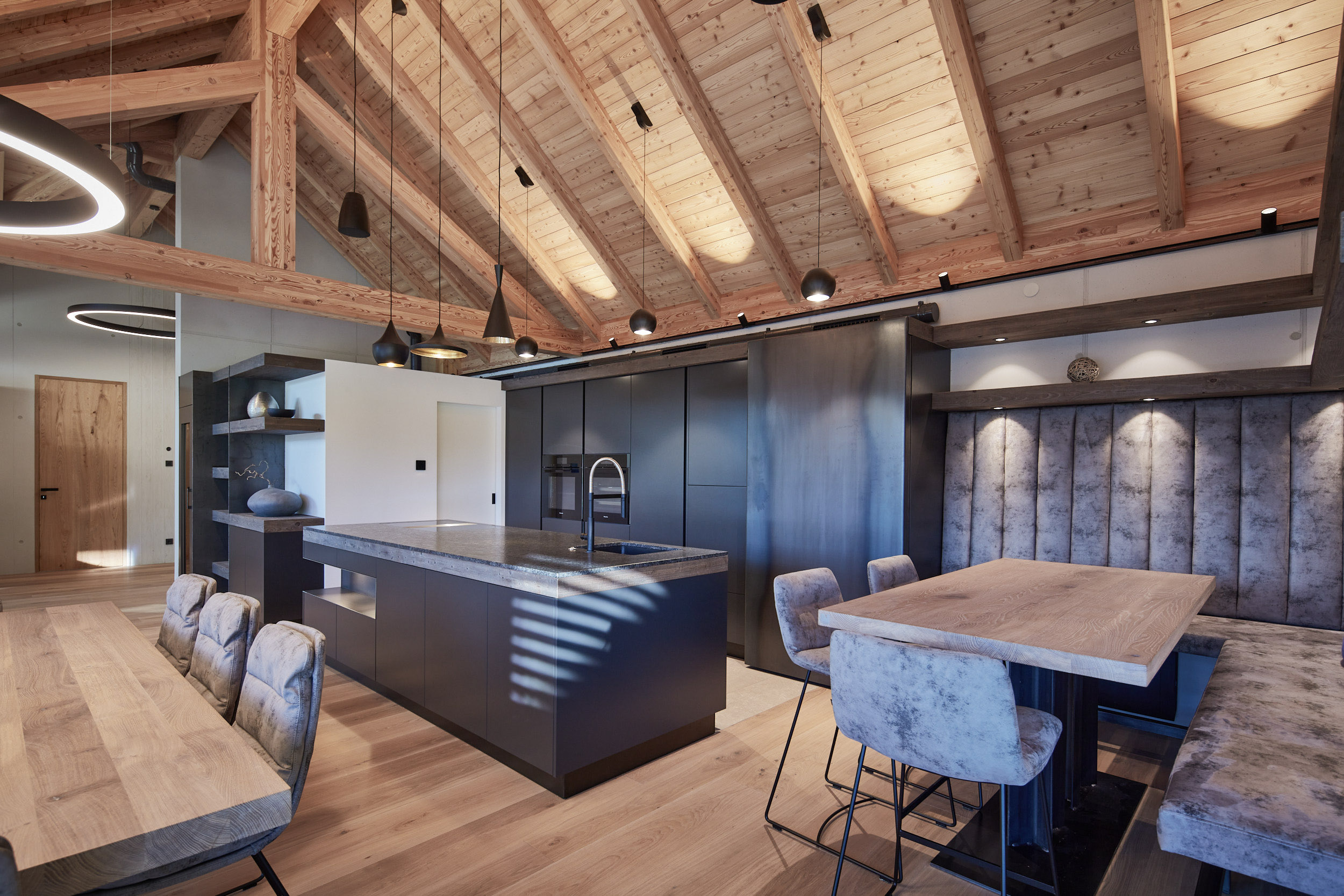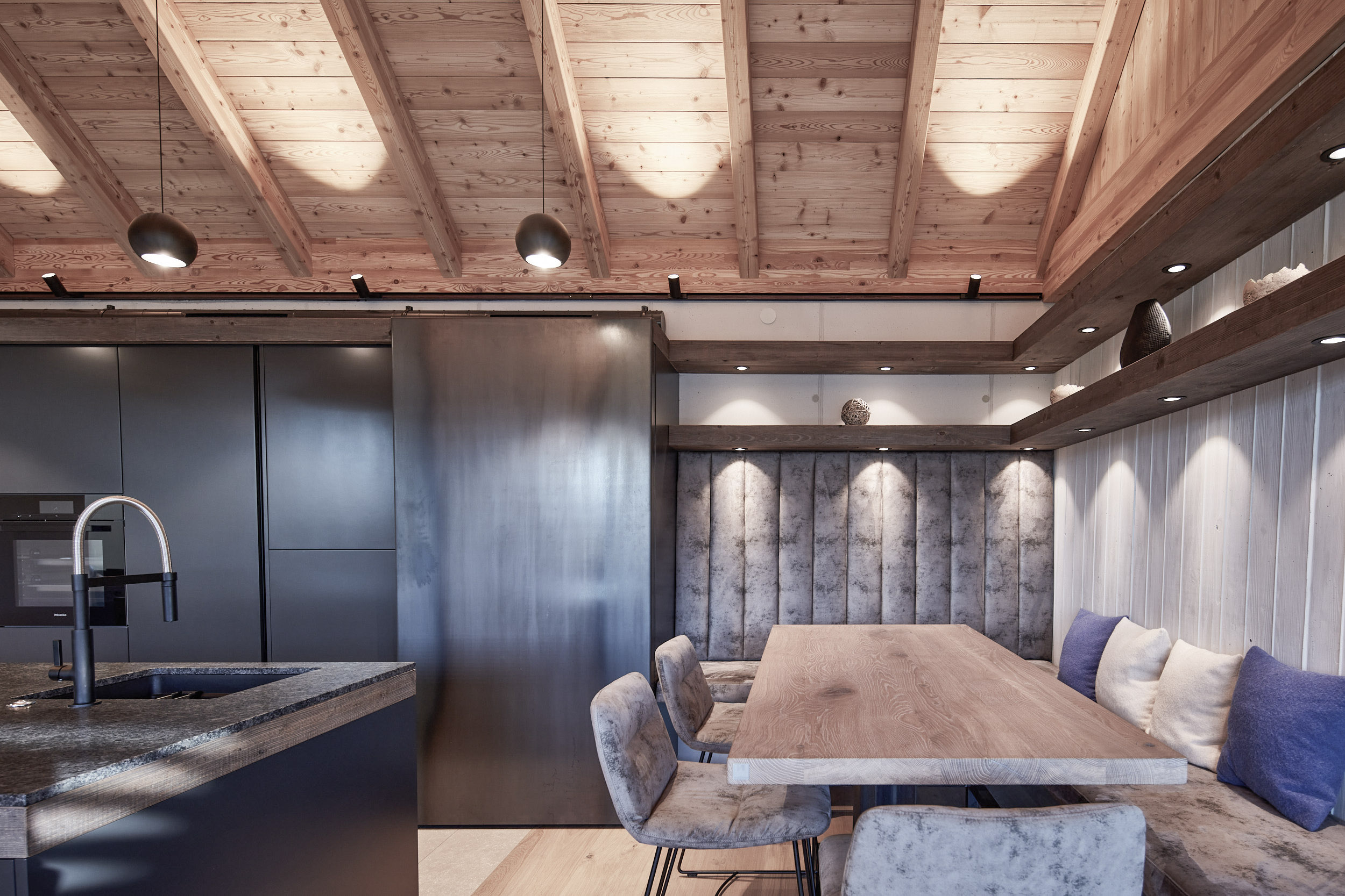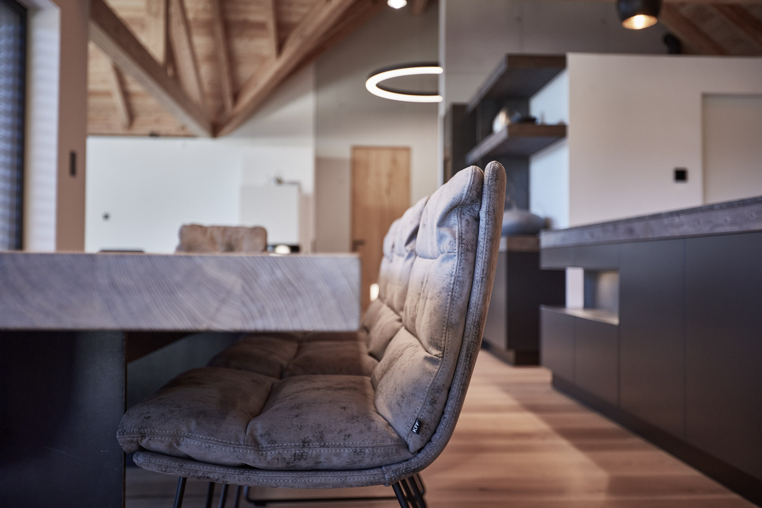 Die Küche verfügt über eine Hochbank mit einer hohen Rückenlehne, die mit Leder und Beton kombiniert wurde. Darüber befinden sich Holz-Fächer in grauem Altholz, die nicht nur für Stauraum, sondern auch für eine stimmungsvolle Atmosphäre sorgen. Ein Hochtisch in Eiche weiß pigmentiert rundet das Gesamtbild ab und bietet einen gemütlichen Ort zum Speisen.