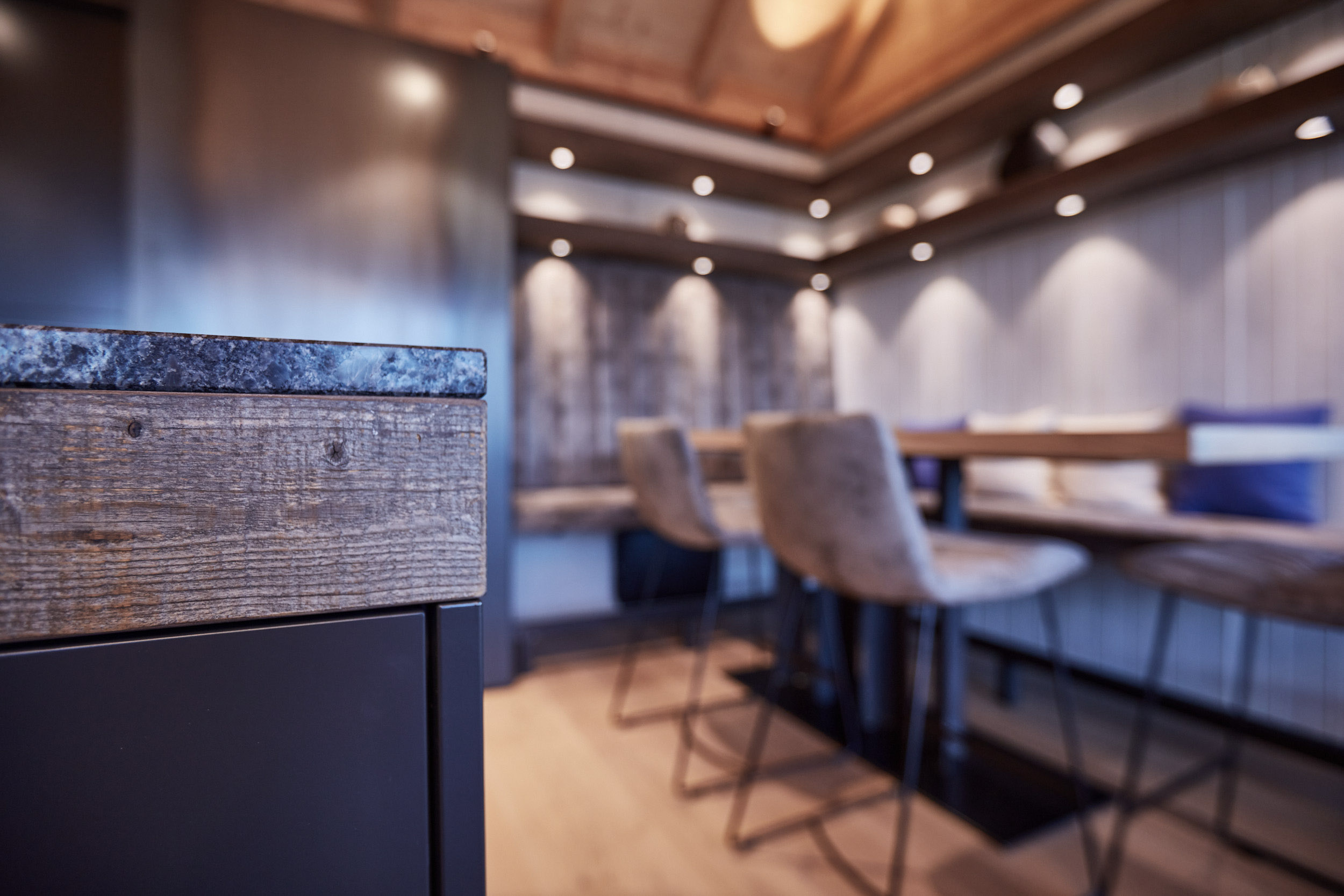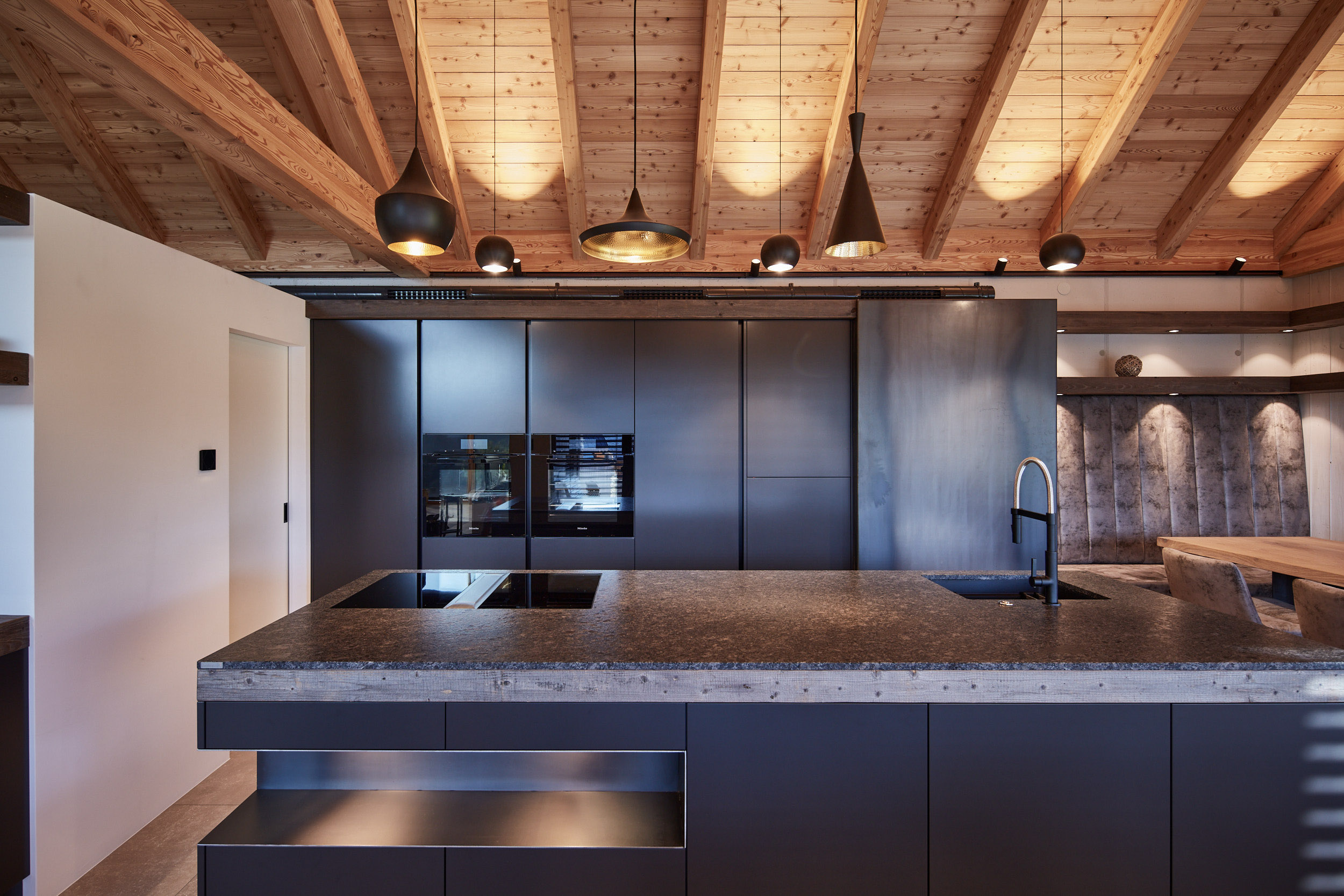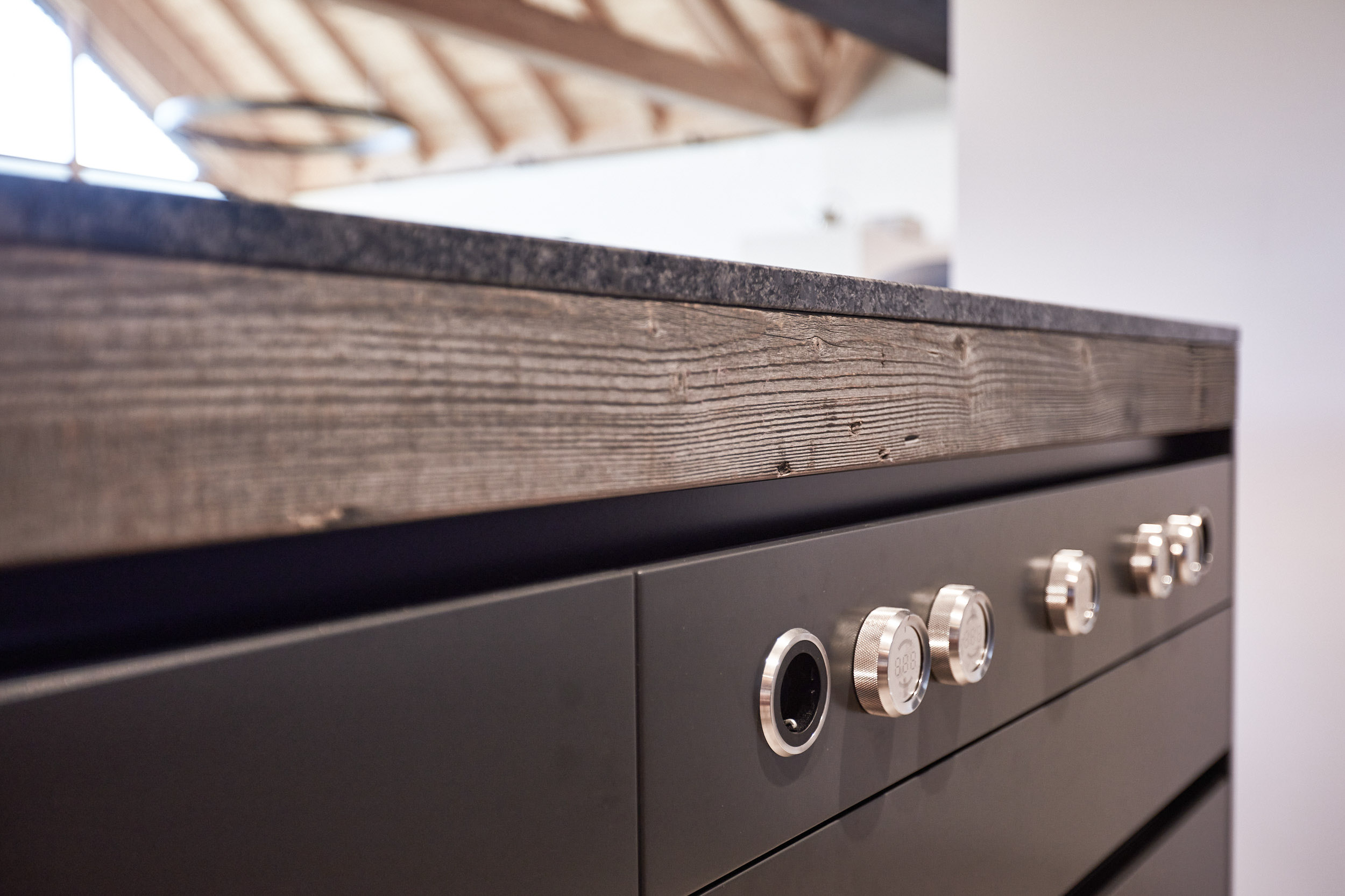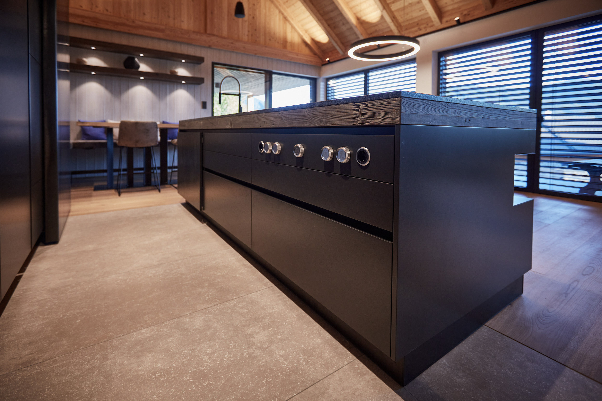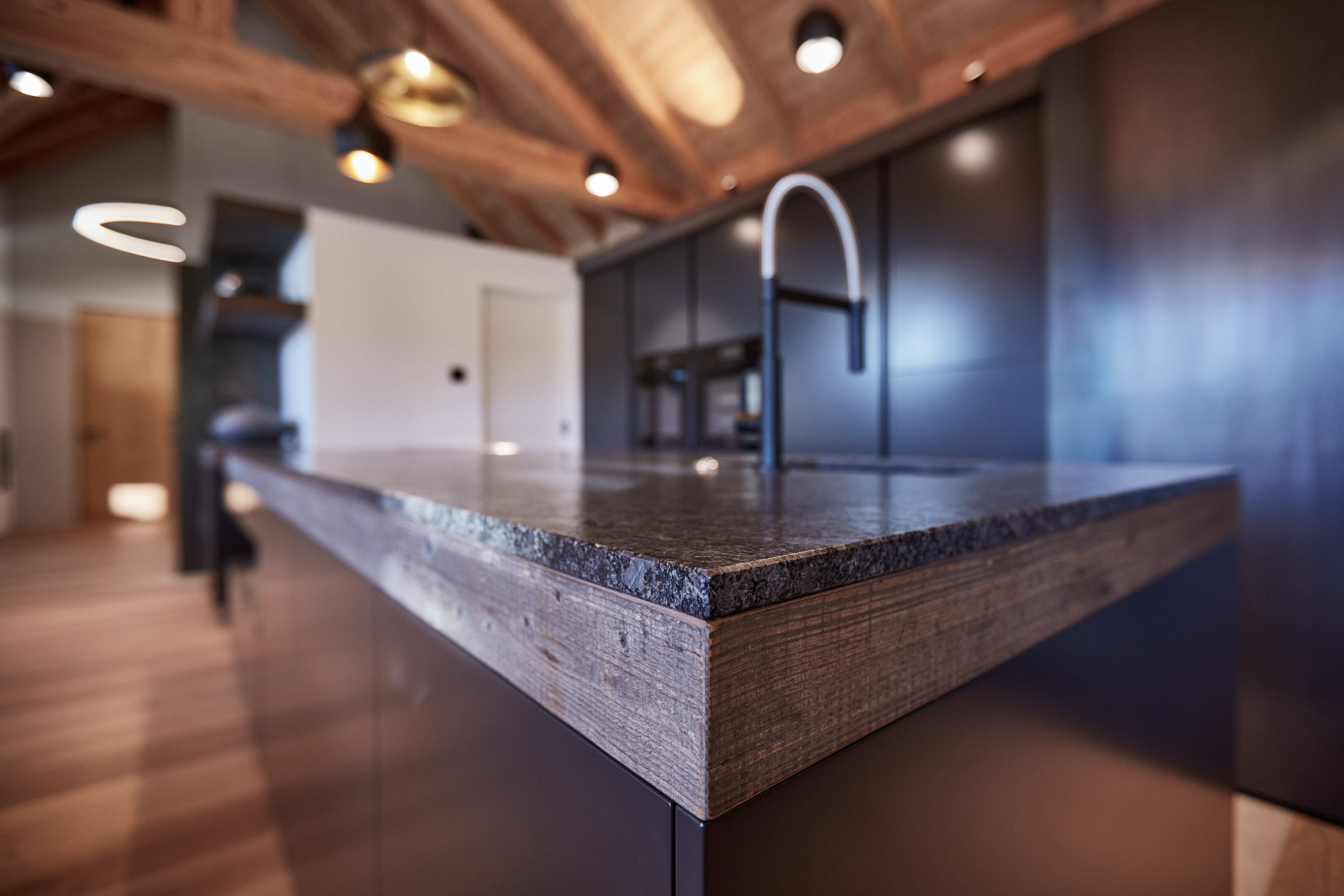 Die Küche verfügt über eine Hochbank mit einer hohen Rückenlehne, die mit Leder und Beton kombiniert wurde. Darüber befinden sich Holz-Fächer in grauem Altholz, die nicht nur für Stauraum, sondern auch für eine stimmungsvolle Atmosphäre sorgen. Ein Hochtisch in Eiche weiß pigmentiert rundet das Gesamtbild ab und bietet einen gemütlichen Ort zum Speisen.