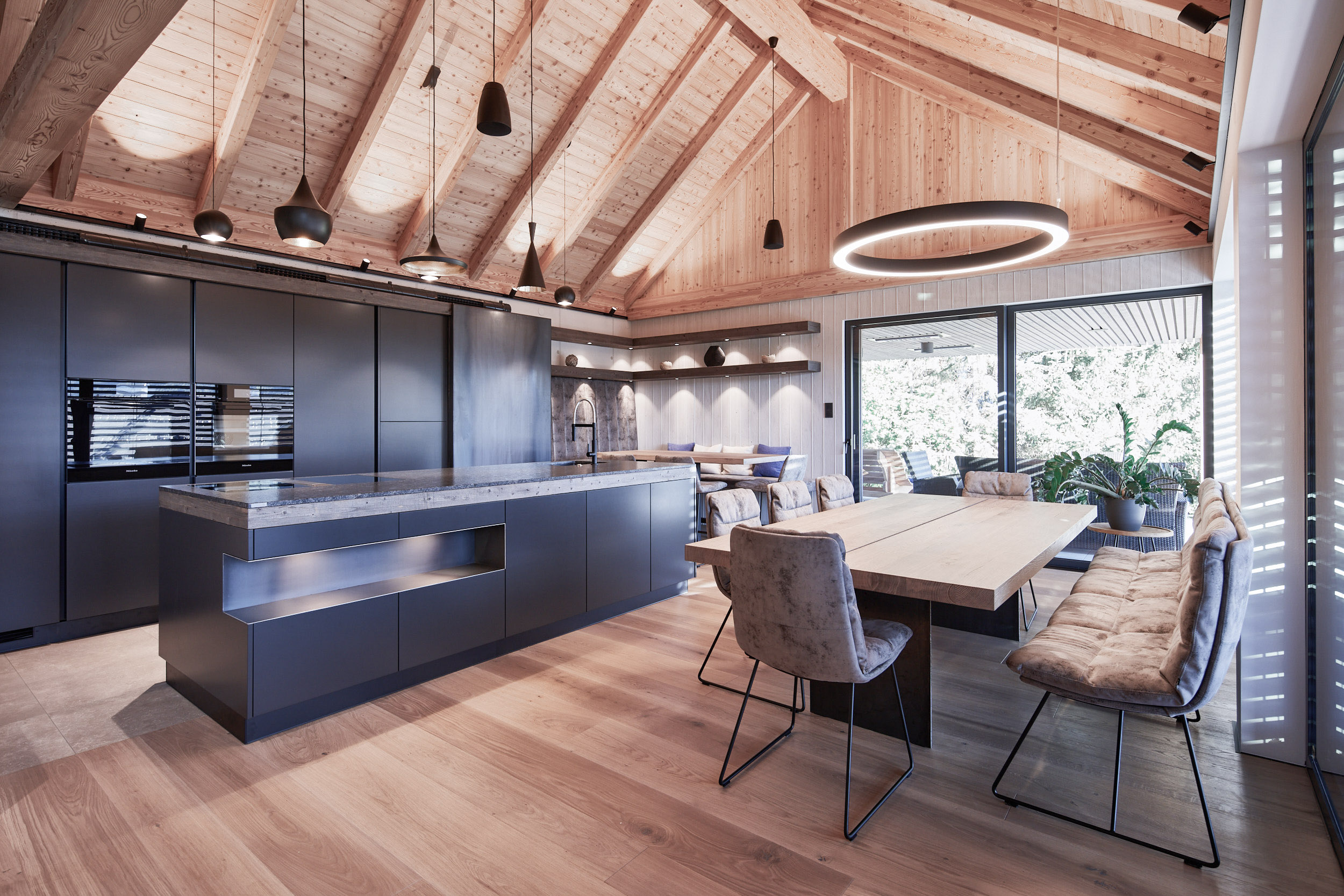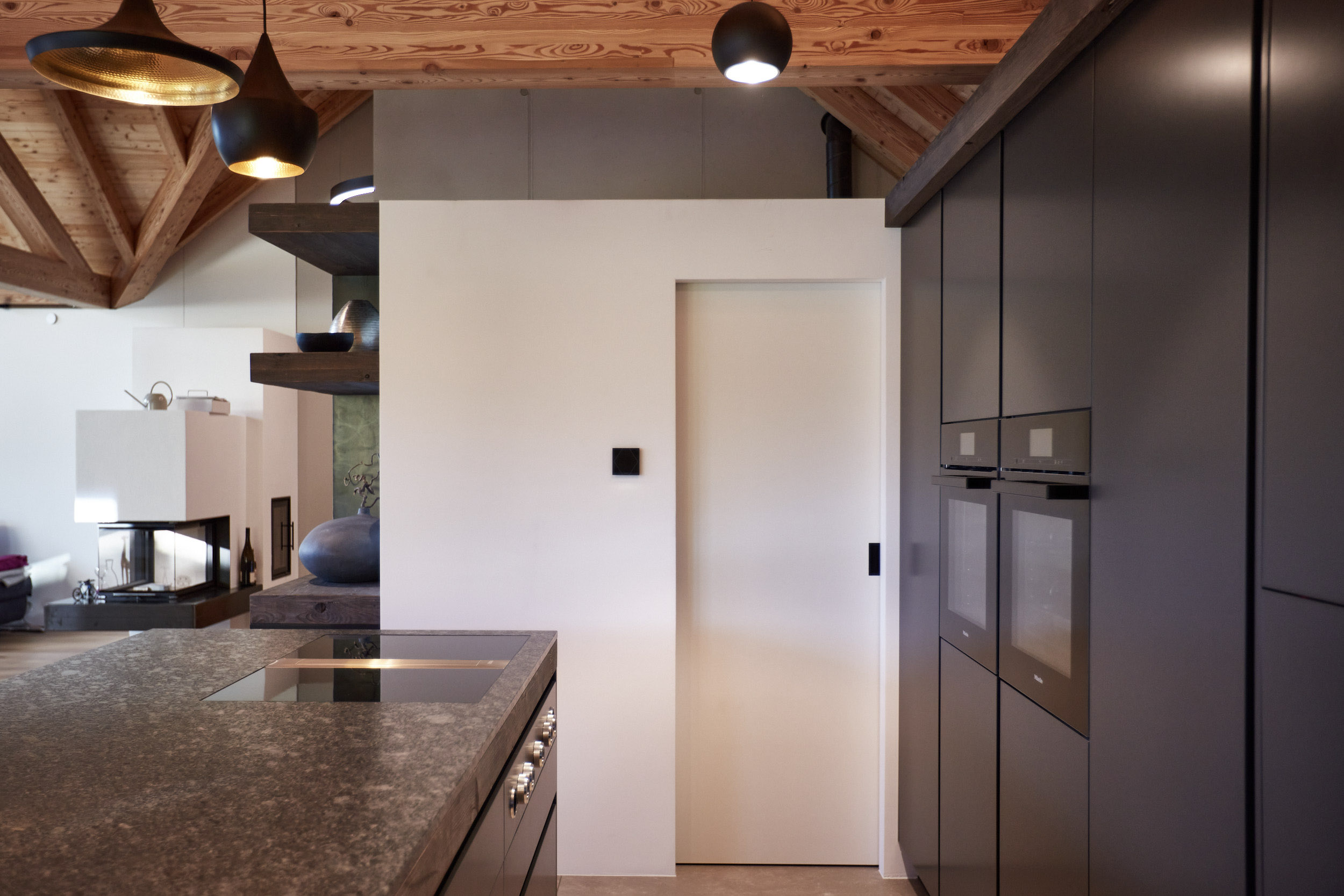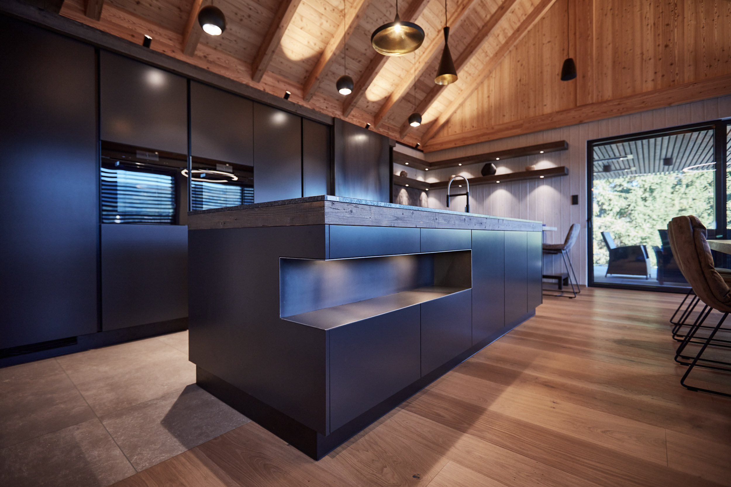Die Küche in diesem Holzhaus wurde äußerst durchdacht gestaltet. Sie verfügt über eine versteckte Arbeitsplatte davor laufend eine beeindruckende Rohstahlschiebetür. Eine geräumige Speisekammer und eine großzügige Insel mit einer edlen Granitplatte bieten viel Platz und Funktionalität. Ein Weinkühlschrank mit einem angrenzenden Regal sorgt für das gewisse Extra an Luxus und Stil.