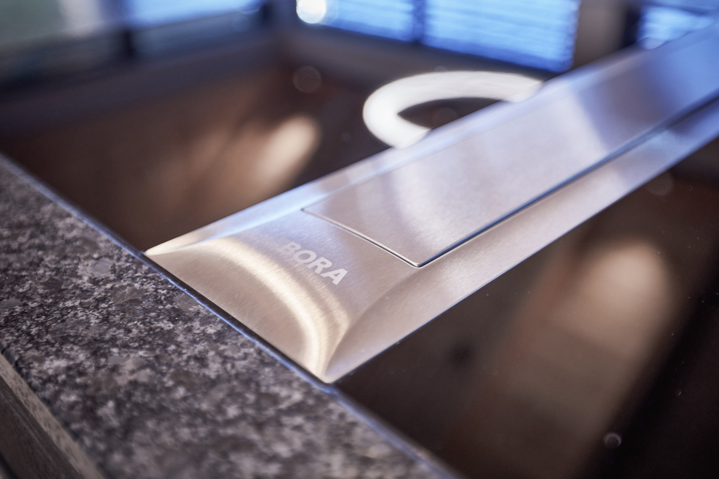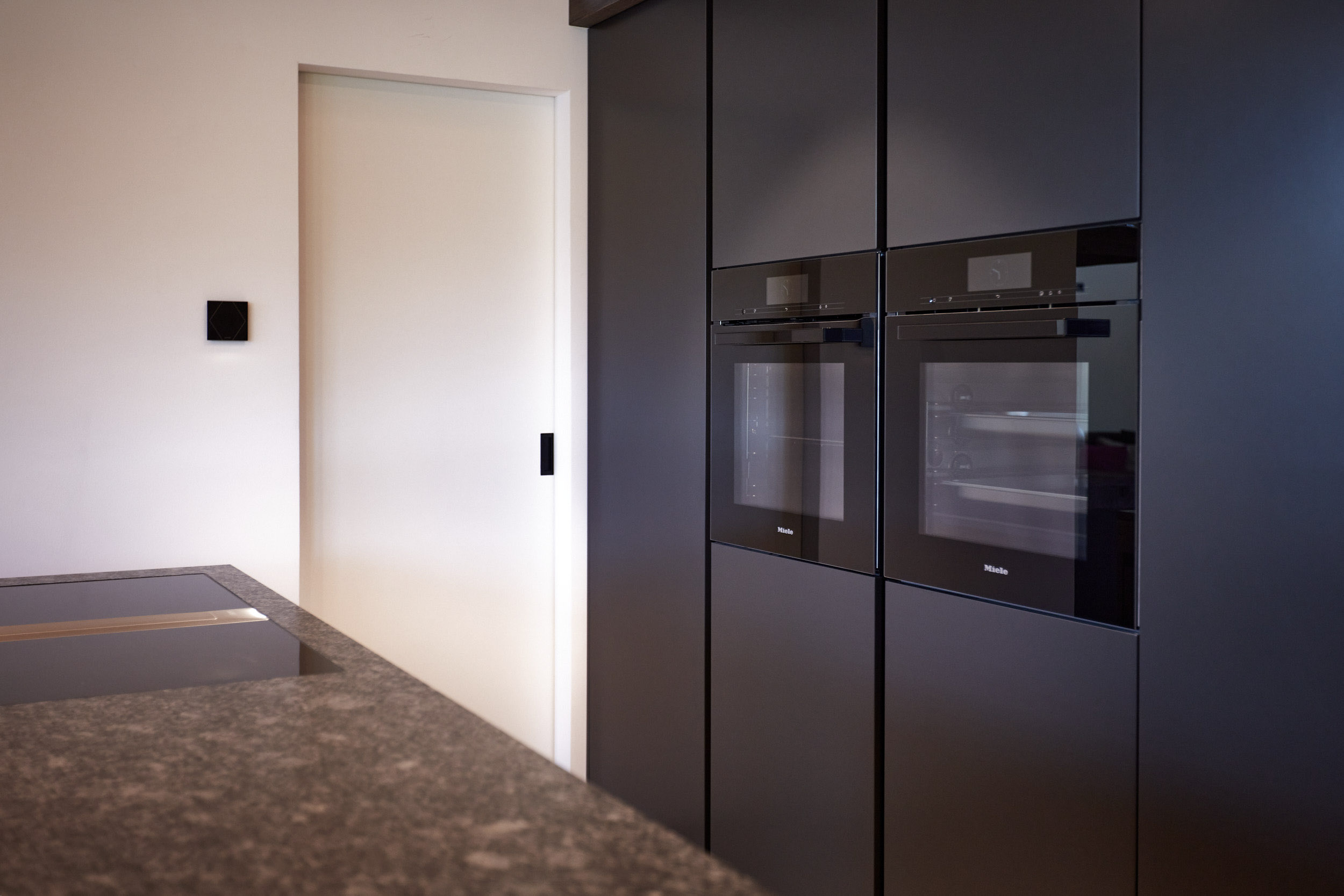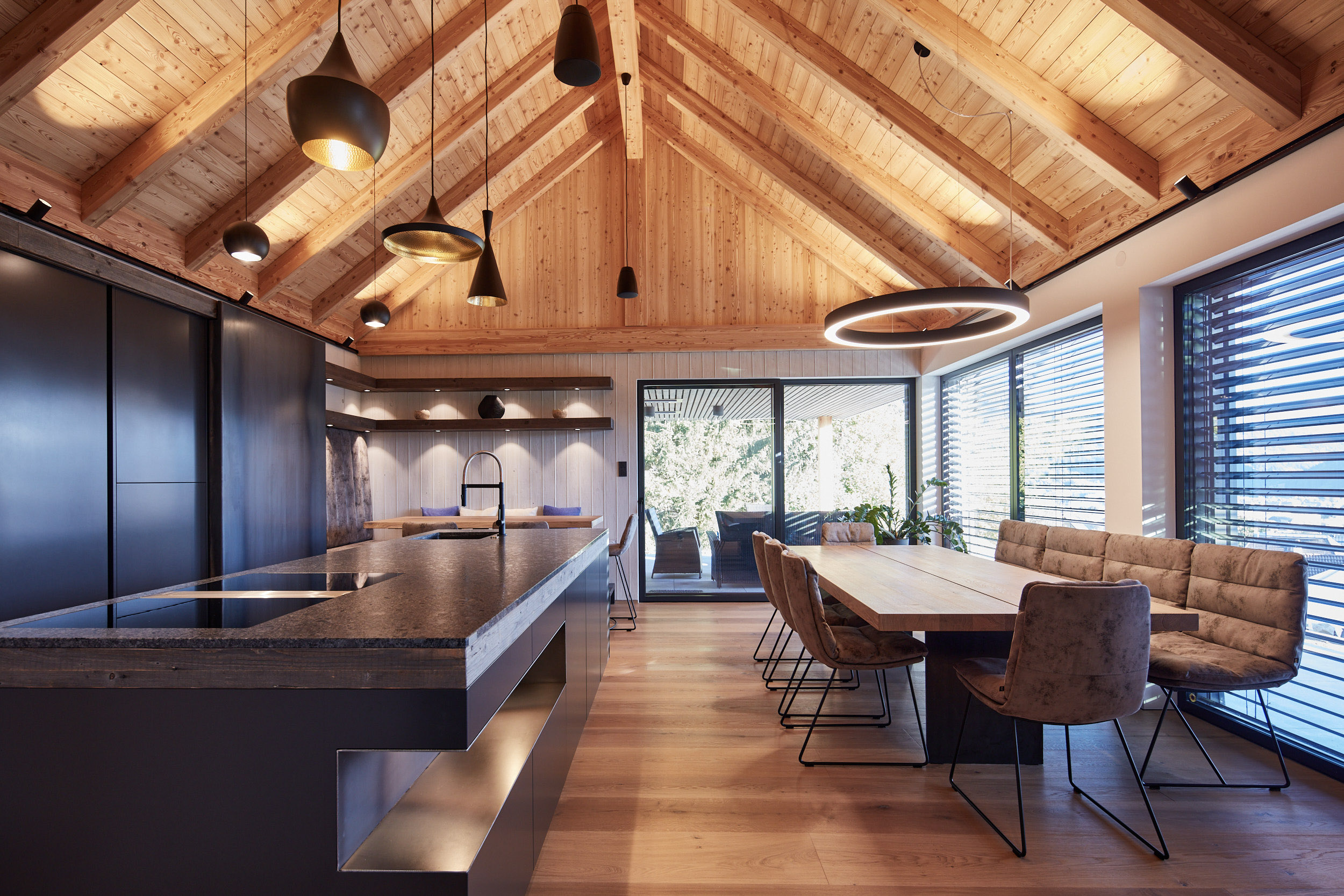 Die Küche in diesem Holzhaus wurde äußerst durchdacht gestaltet. Sie verfügt über eine versteckte Arbeitsplatte davor laufend eine beeindruckende Rohstahlschiebetür. Eine geräumige Speisekammer und eine großzügige Insel mit einer edlen Granitplatte bieten viel Platz und Funktionalität. Ein Weinkühlschrank mit einem angrenzenden Regal sorgt für das gewisse Extra an Luxus und Stil.