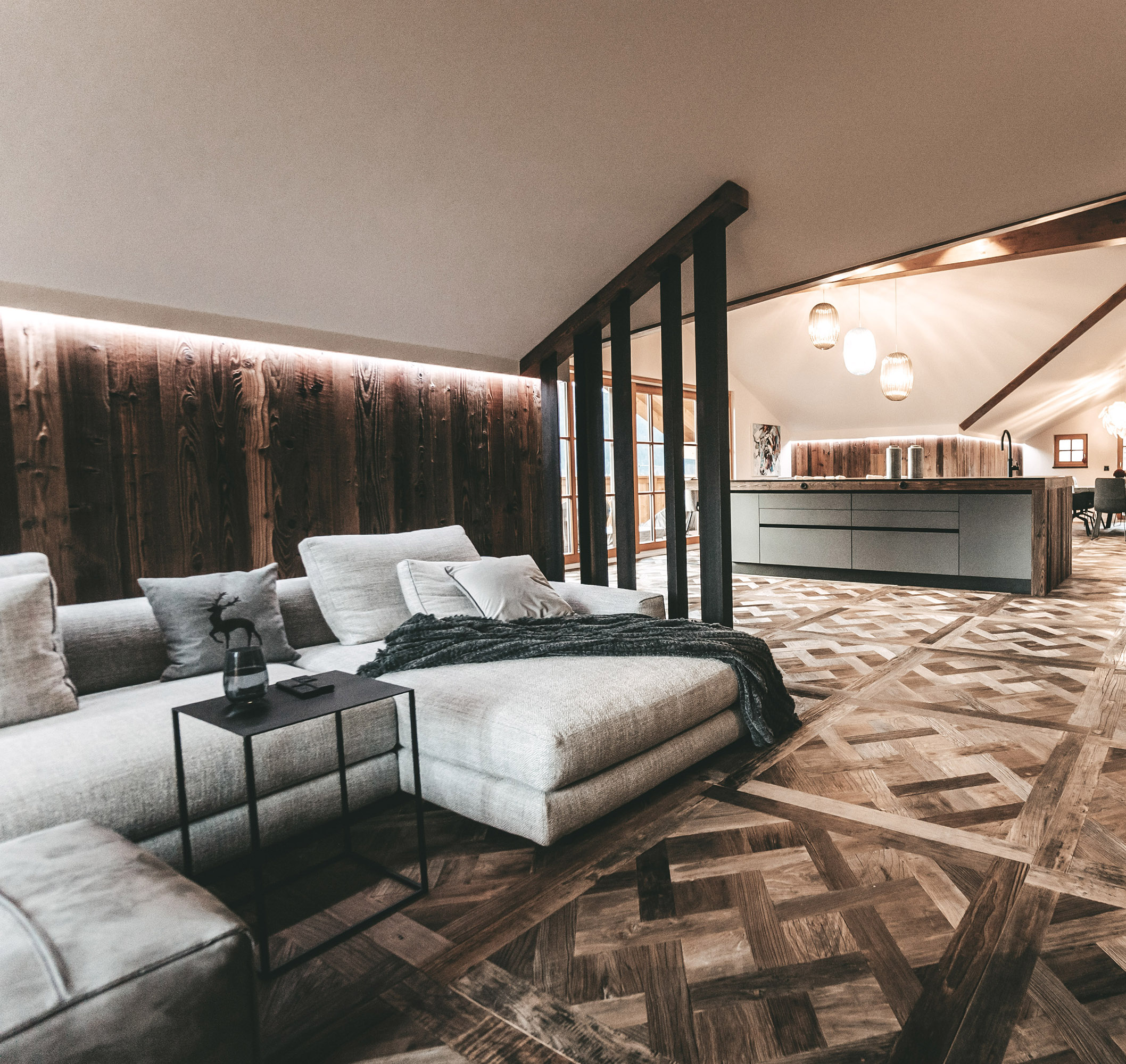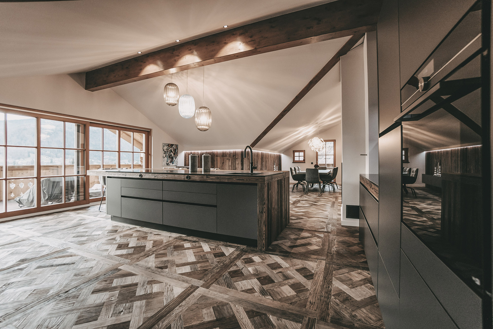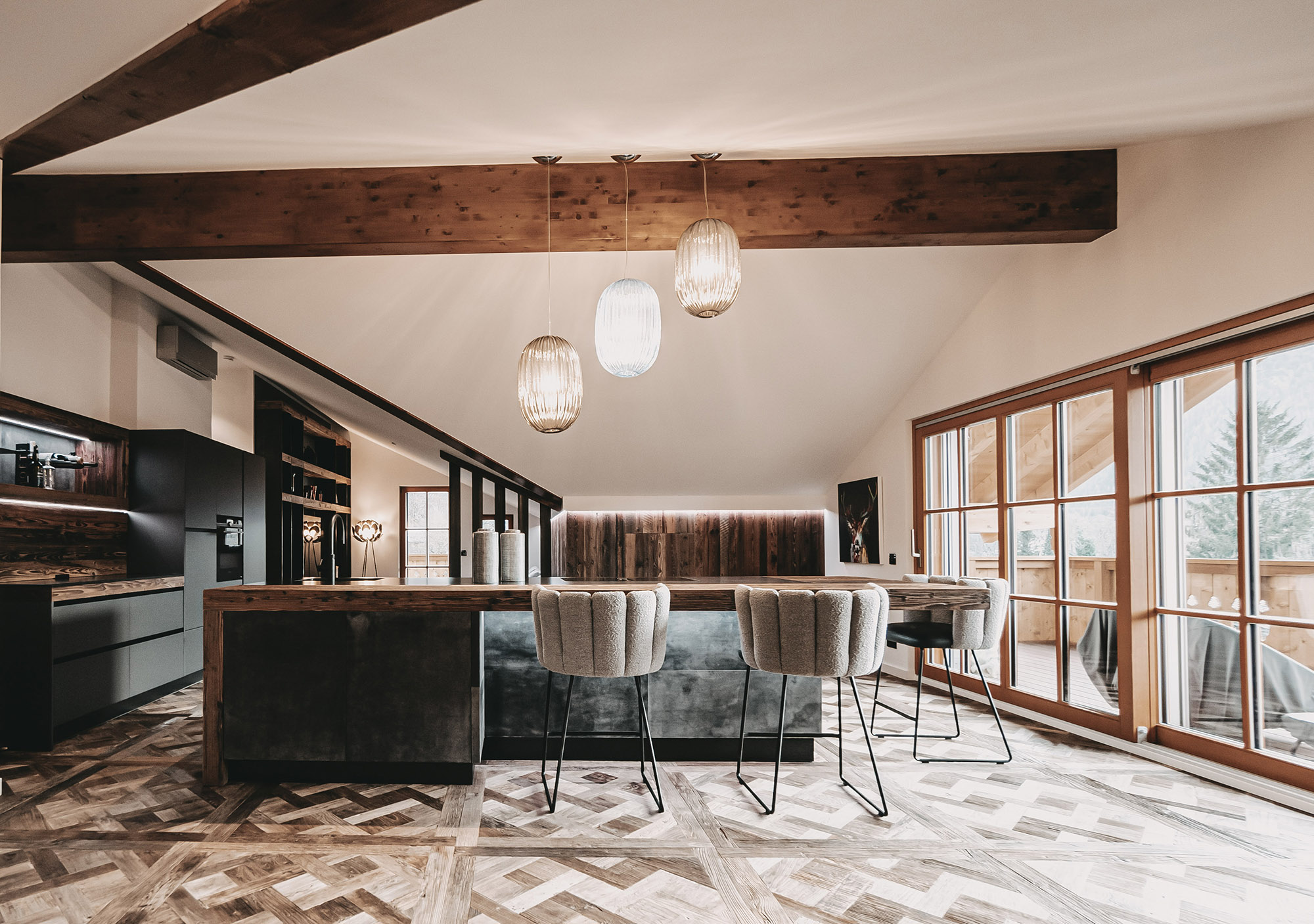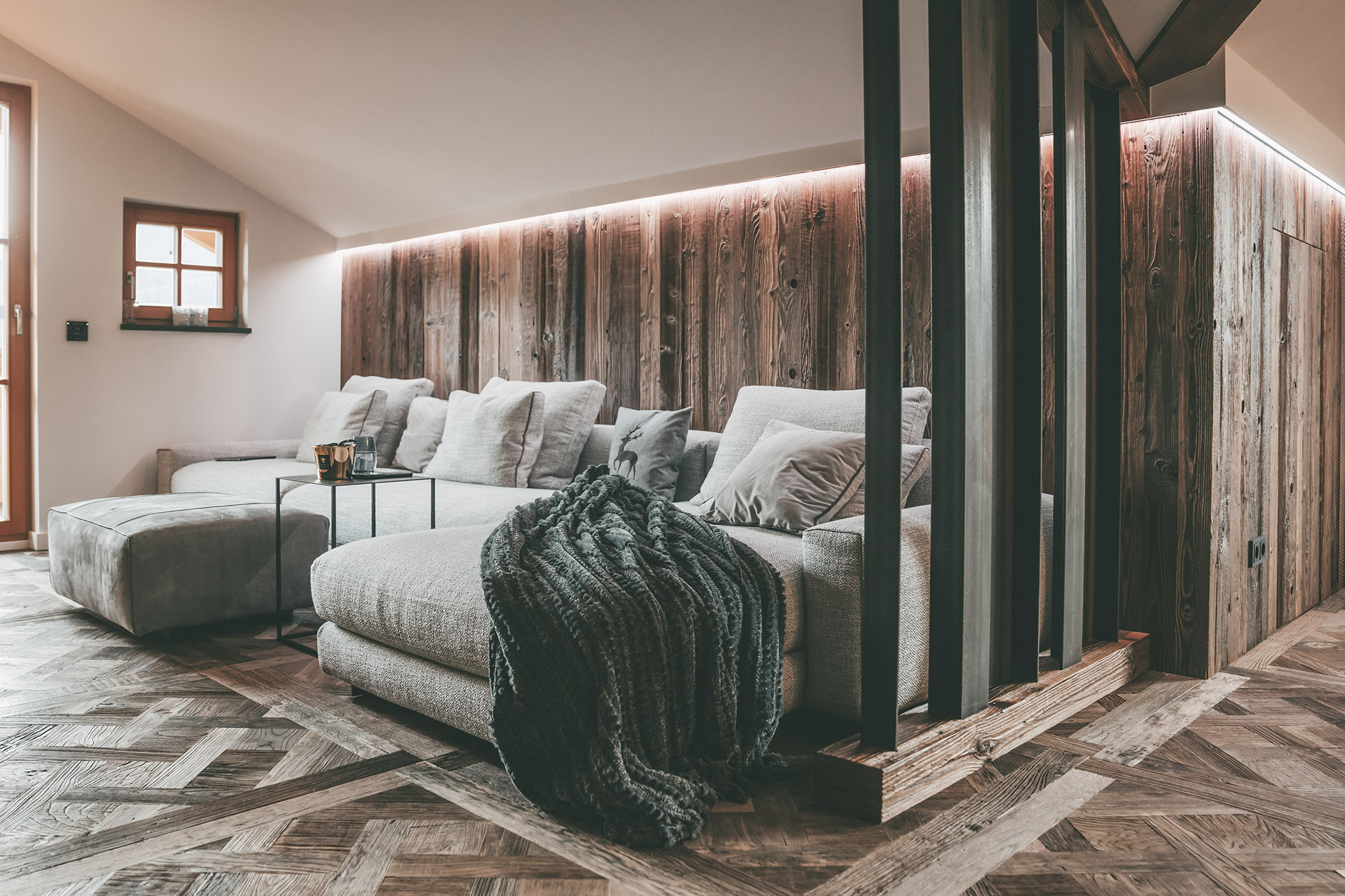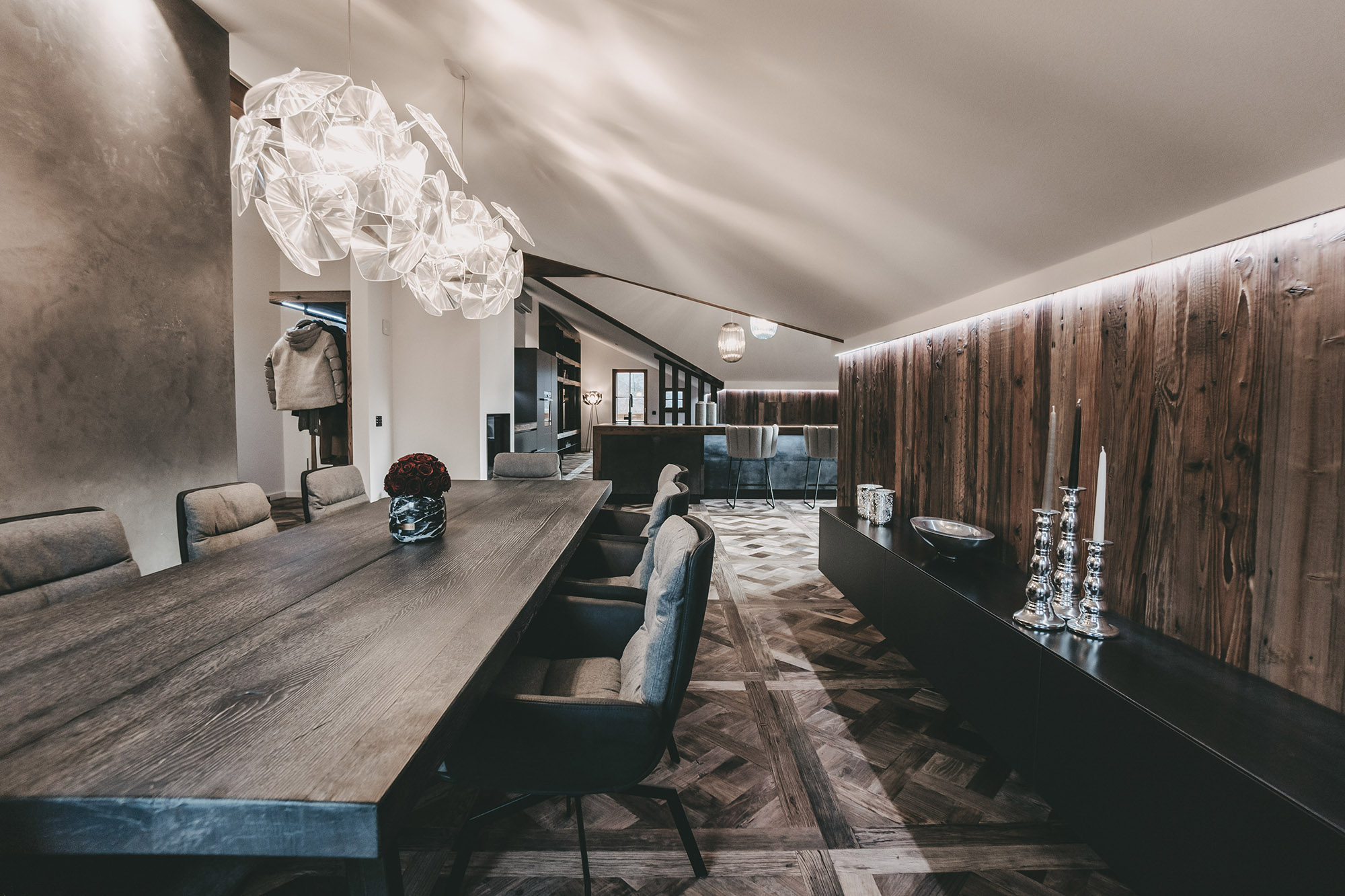 Willkommen in diesem beeindruckenden Penthouse in Berchtesgaden, gestaltet von Michael Sendlhofer von Sendlhofer Design GmbH. Hier vereinen sich traditionelle Elemente mit modernem Design zu einem harmonischen Ganzen. Der warme Parkettboden aus Altholz, die elegante Küche mit Barbereich, und gemütliche Barhocker schaffen eine einladende Atmosphäre. Rustikale Wandverkleidungen, eine moderne Couch von „Arketipo“, und das stimmungsvolle Schlafzimmer mit hinterleuchteter Altholzwand fügen sich nahtlos in das Gesamtkonzept ein. Besonders hervorzuheben sind der stilvolle Esstisch aus Eiche, umgeben von Leder- und Leinenstühlen, sowie der Designer-Lounger „Sinus“ von COR. Dieses Penthouse ist ein wunderschöner Wohnraum, der mit Liebe zum Detail gestaltet wurde und Tradition mit modernem Wohnkomfort verbindet.