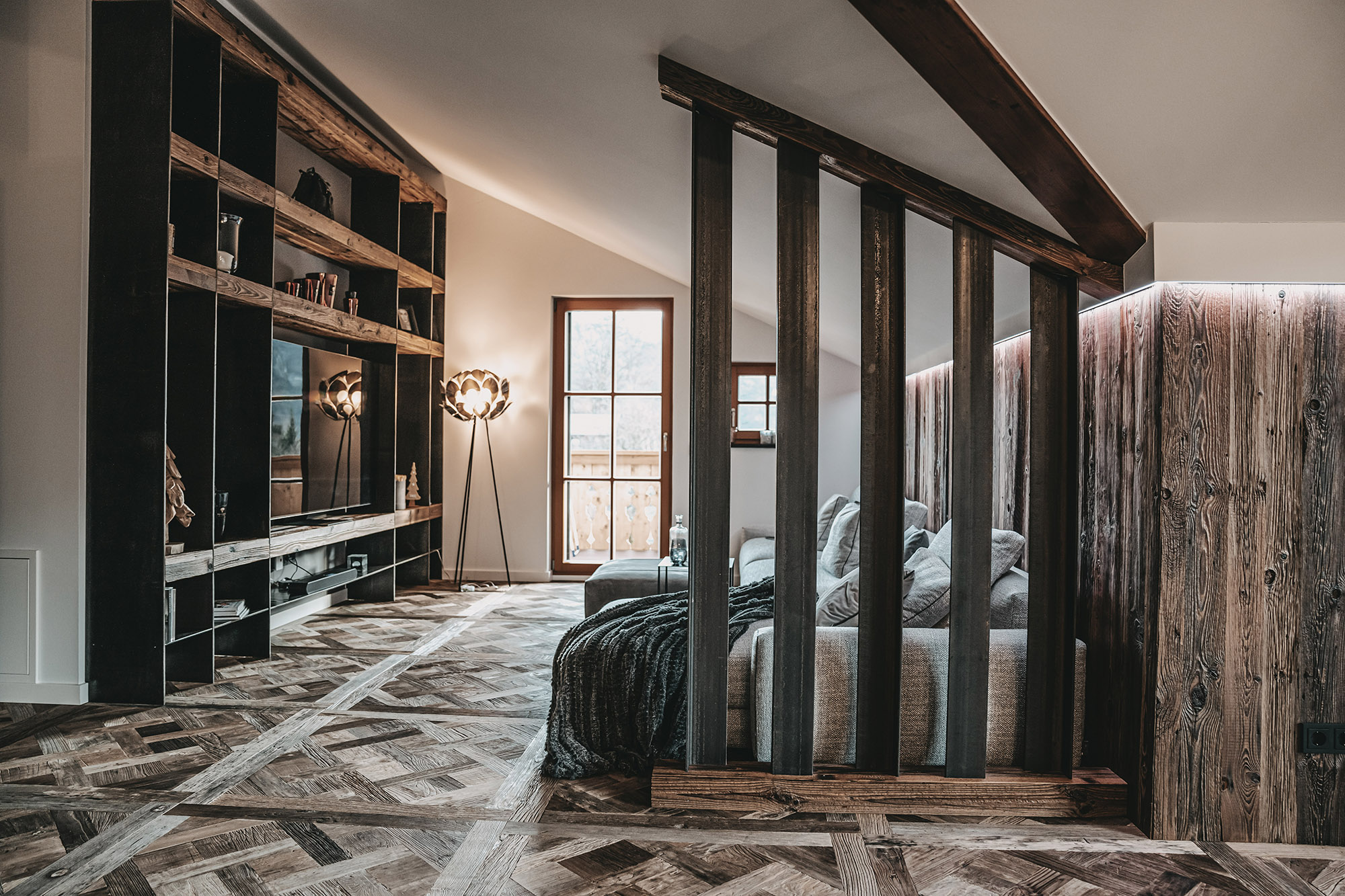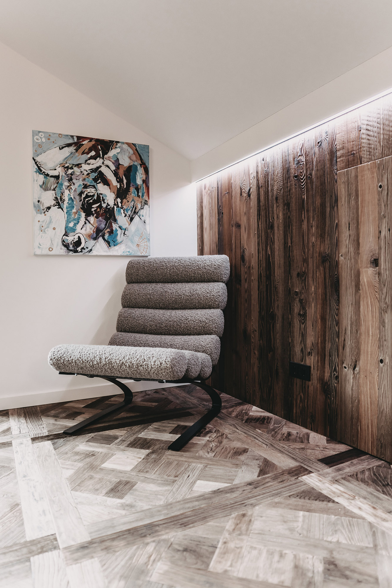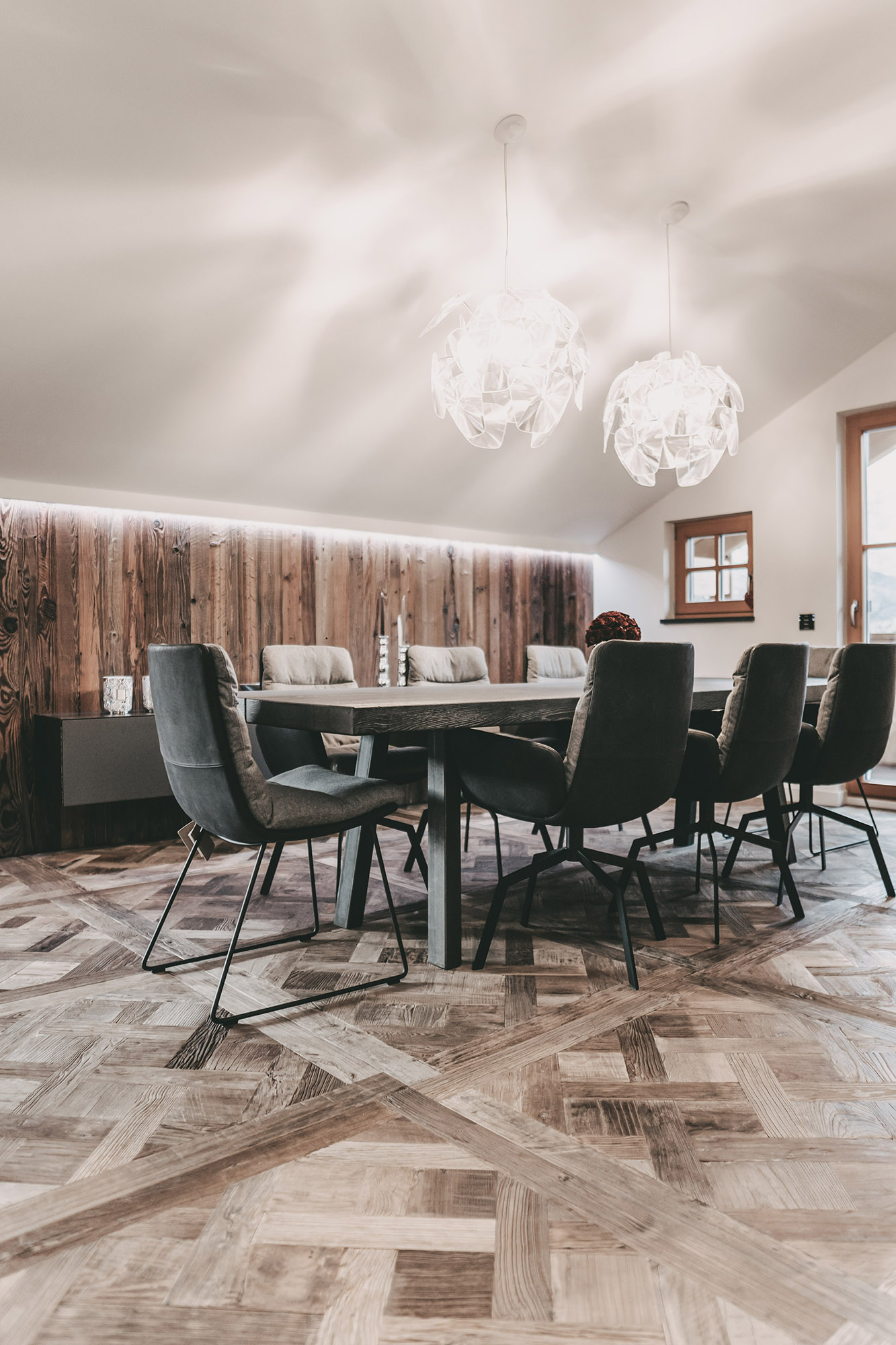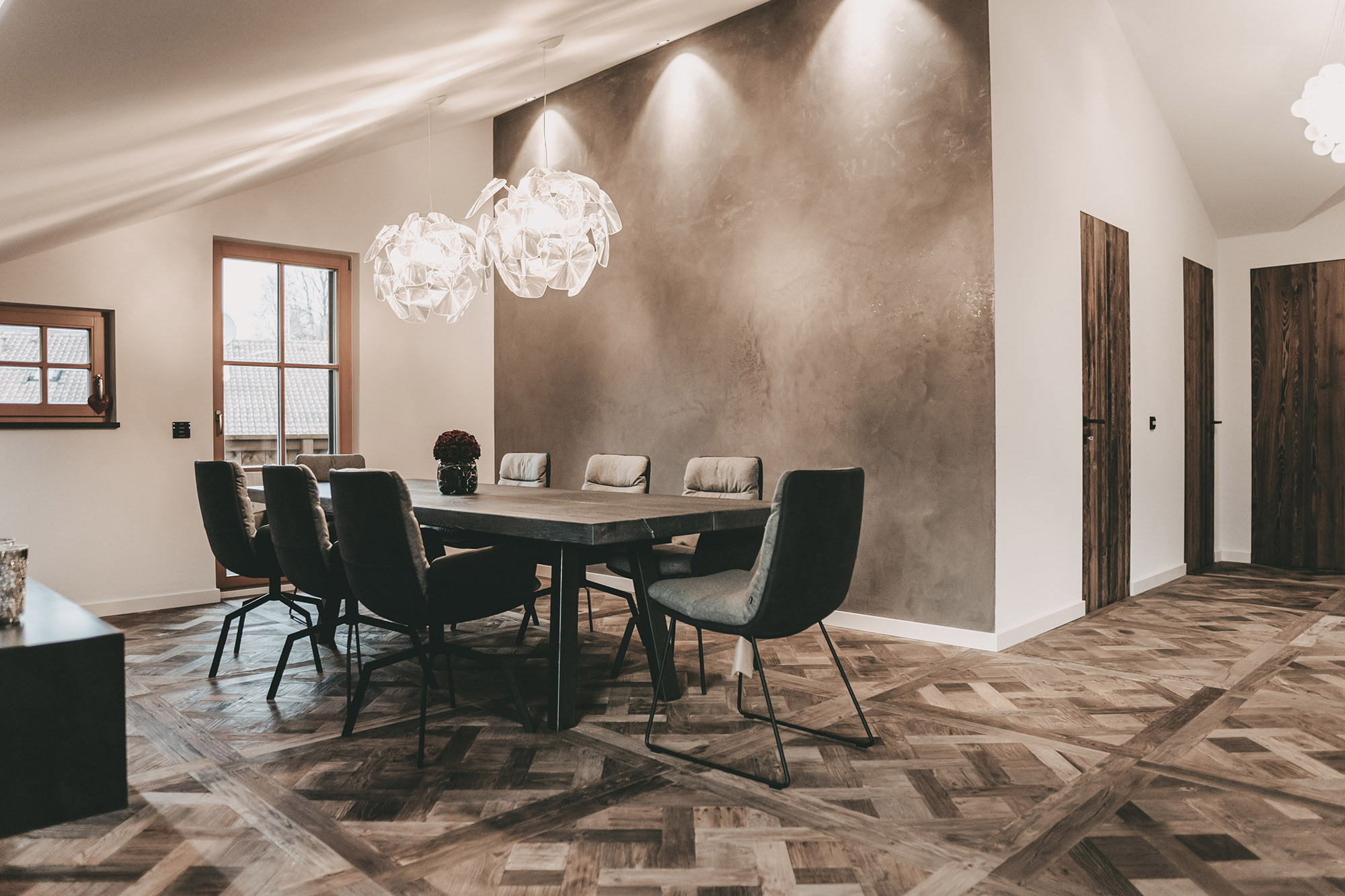 Willkommen in diesem beeindruckenden Penthouse in Berchtesgaden, gestaltet von Michael Sendlhofer von Sendlhofer Design GmbH. Hier vereinen sich traditionelle Elemente mit modernem Design zu einem harmonischen Ganzen. Der warme Parkettboden aus Altholz, die elegante Küche mit Barbereich, und gemütliche Barhocker schaffen eine einladende Atmosphäre. Rustikale Wandverkleidungen, eine moderne Couch von „Arketipo“, und das stimmungsvolle Schlafzimmer mit hinterleuchteter Altholzwand fügen sich nahtlos in das Gesamtkonzept ein. Besonders hervorzuheben sind der stilvolle Esstisch aus Eiche, umgeben von Leder- und Leinenstühlen, sowie der Designer-Lounger „Sinus“ von COR. Dieses Penthouse ist ein wunderschöner Wohnraum, der mit Liebe zum Detail gestaltet wurde und Tradition mit modernem Wohnkomfort verbindet.