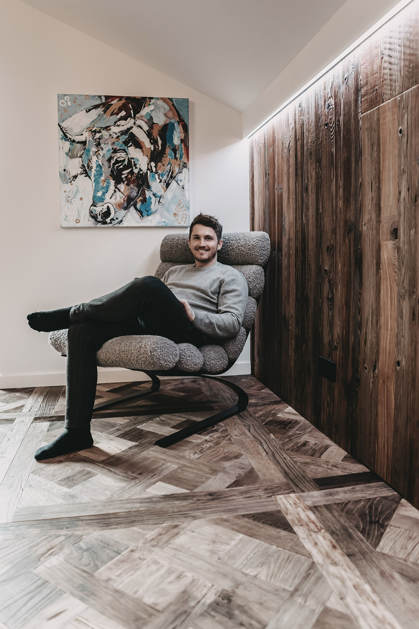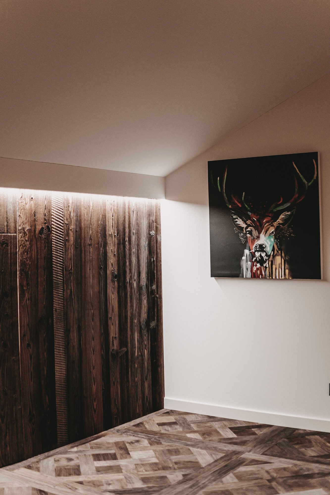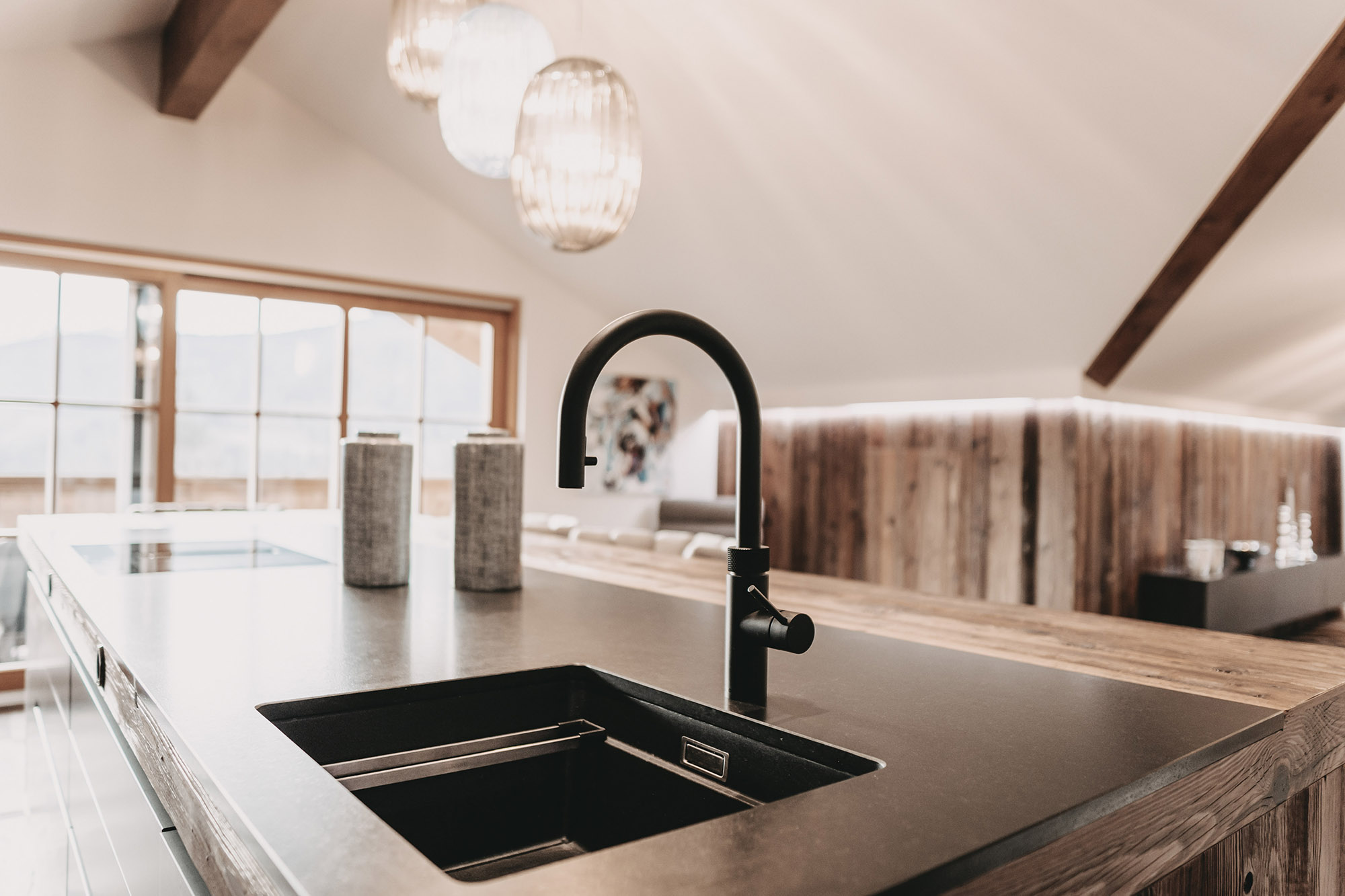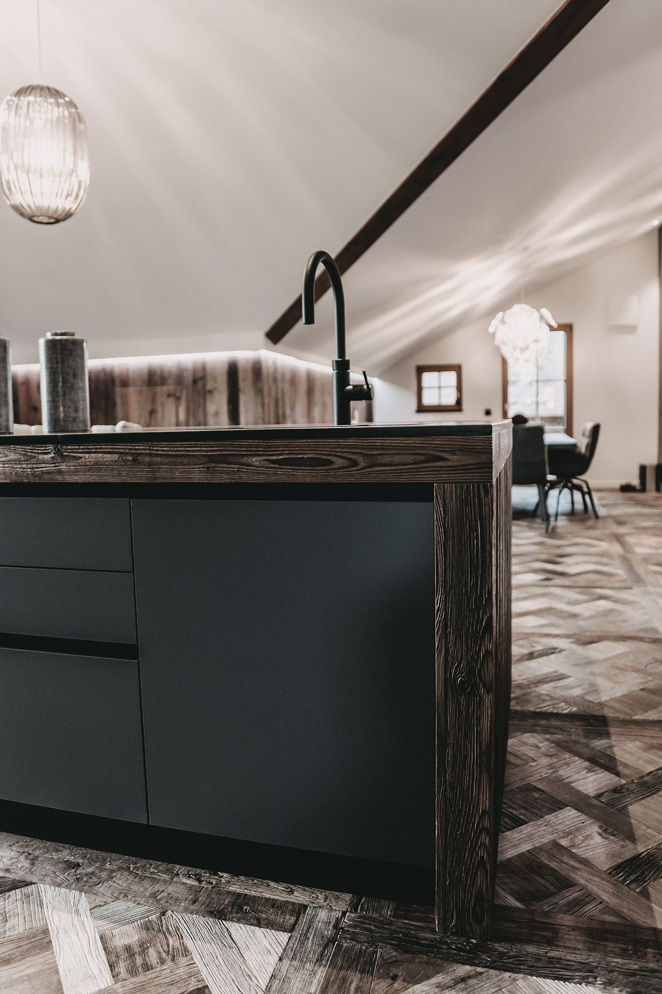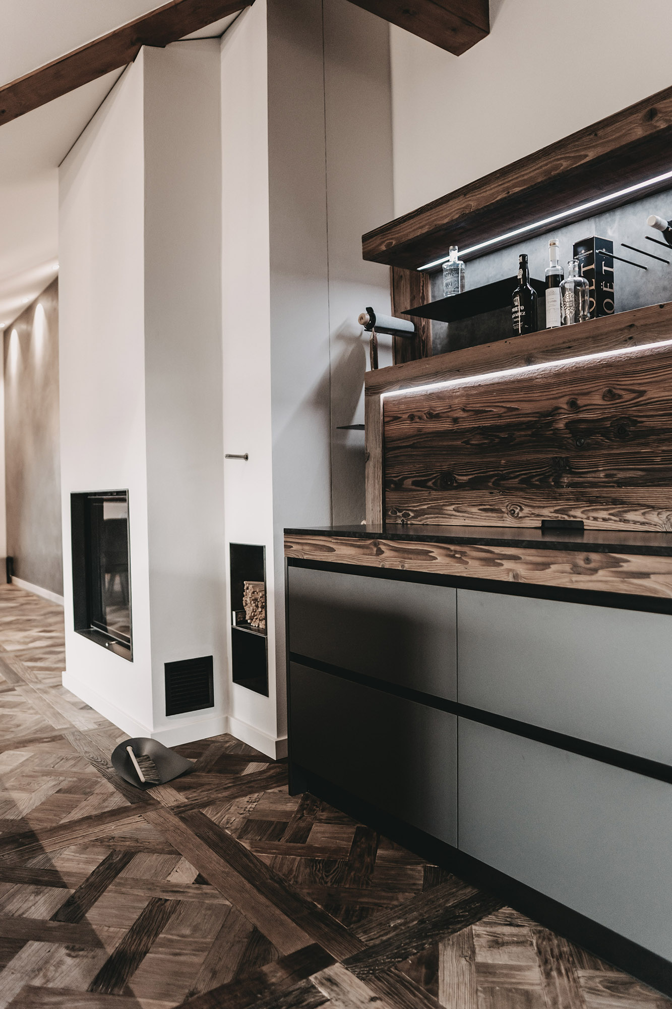 Willkommen in diesem beeindruckenden Penthouse in Berchtesgaden, gestaltet von Michael Sendlhofer von Sendlhofer Design GmbH. Hier vereinen sich traditionelle Elemente mit modernem Design zu einem harmonischen Ganzen. Der warme Parkettboden aus Altholz, die elegante Küche mit Barbereich, und gemütliche Barhocker schaffen eine einladende Atmosphäre. Rustikale Wandverkleidungen, eine moderne Couch von „Arketipo“, und das stimmungsvolle Schlafzimmer mit hinterleuchteter Altholzwand fügen sich nahtlos in das Gesamtkonzept ein. Besonders hervorzuheben sind der stilvolle Esstisch aus Eiche, umgeben von Leder- und Leinenstühlen, sowie der Designer-Lounger „Sinus“ von COR. Dieses Penthouse ist ein wunderschöner Wohnraum, der mit Liebe zum Detail gestaltet wurde und Tradition mit modernem Wohnkomfort verbindet.