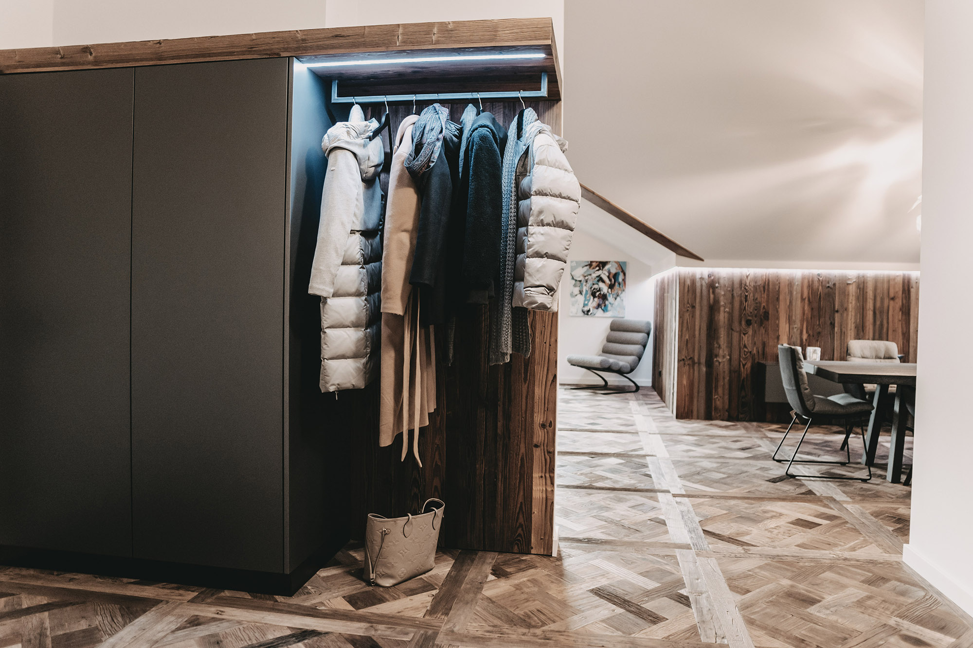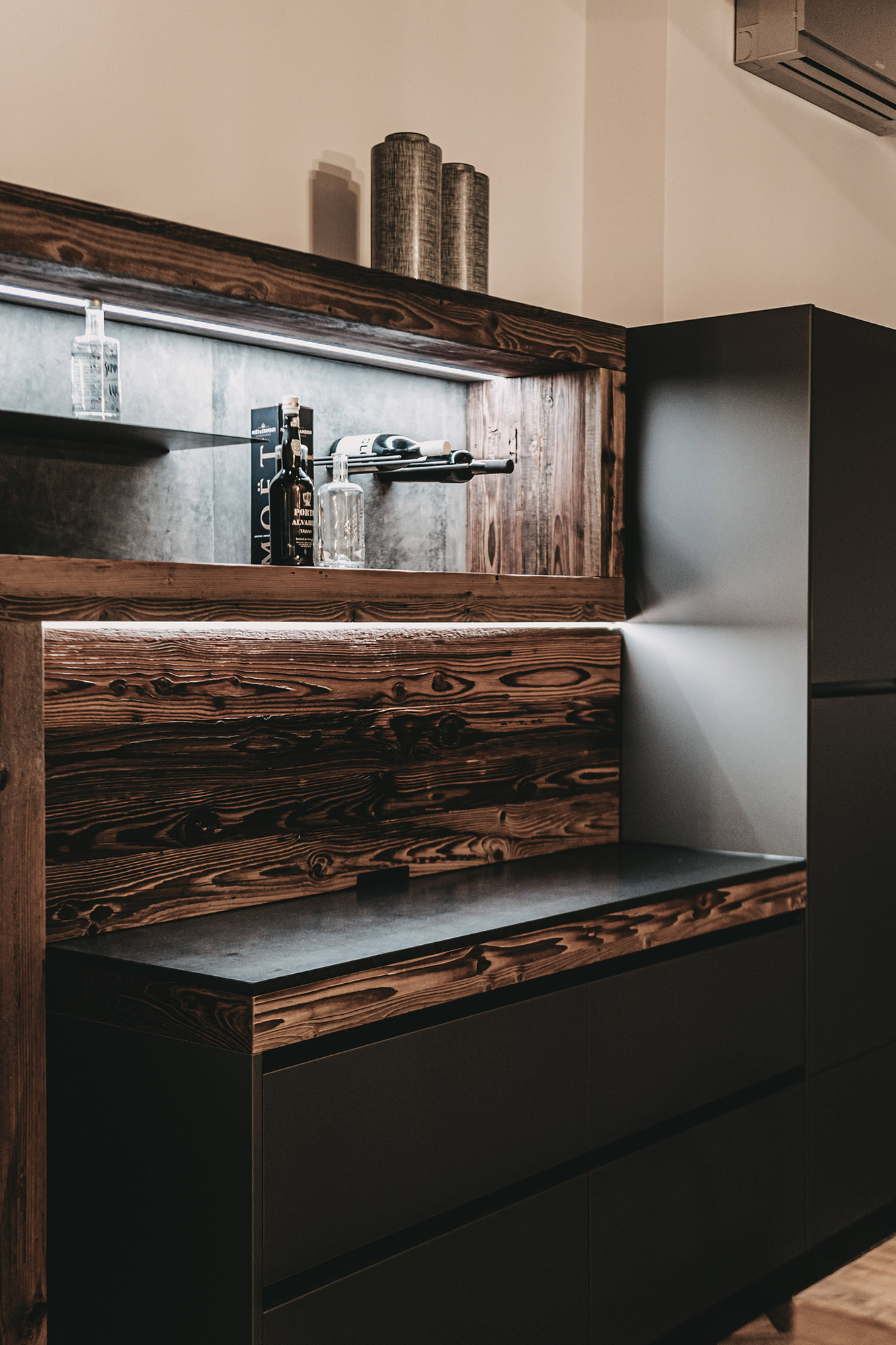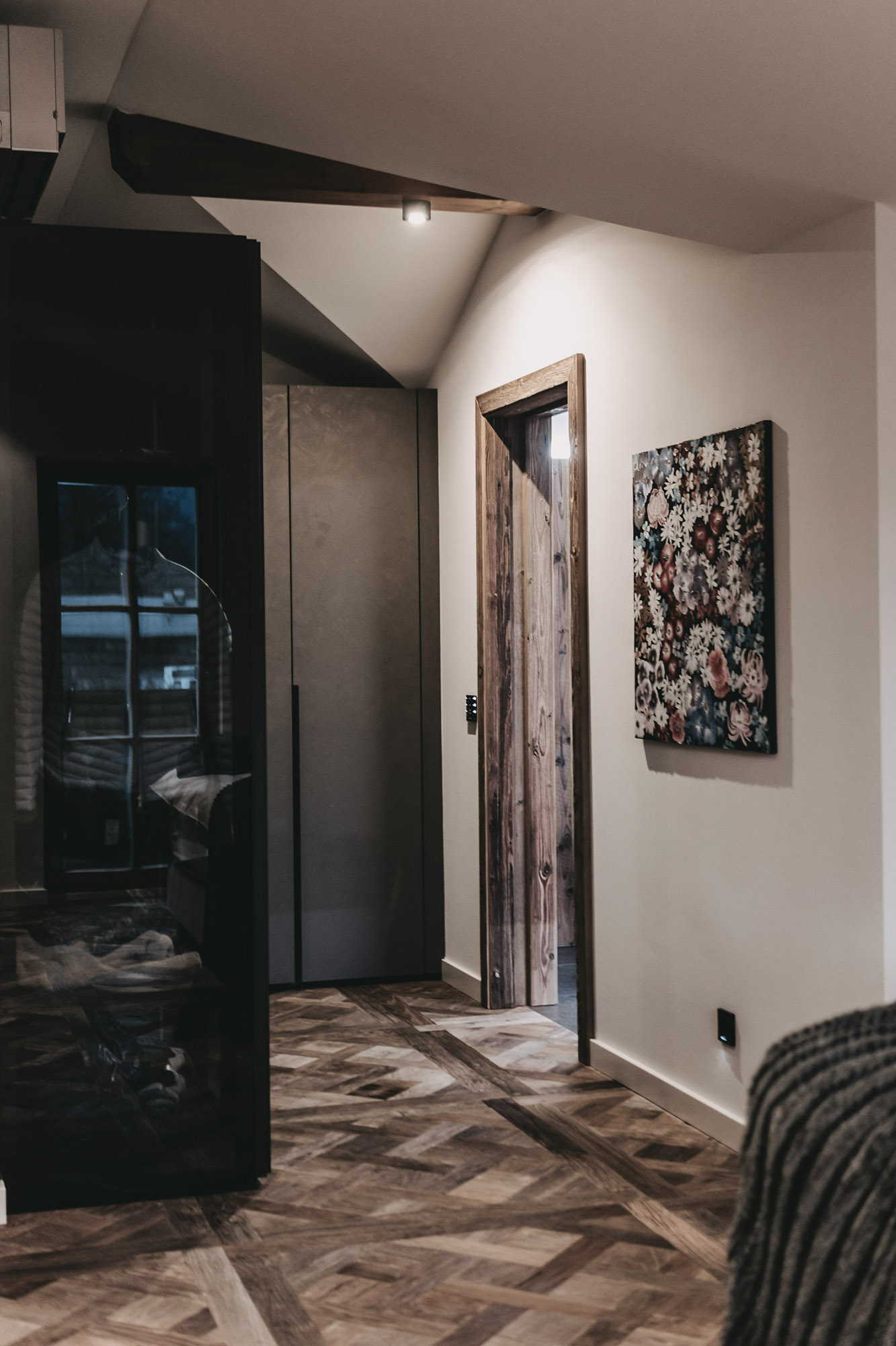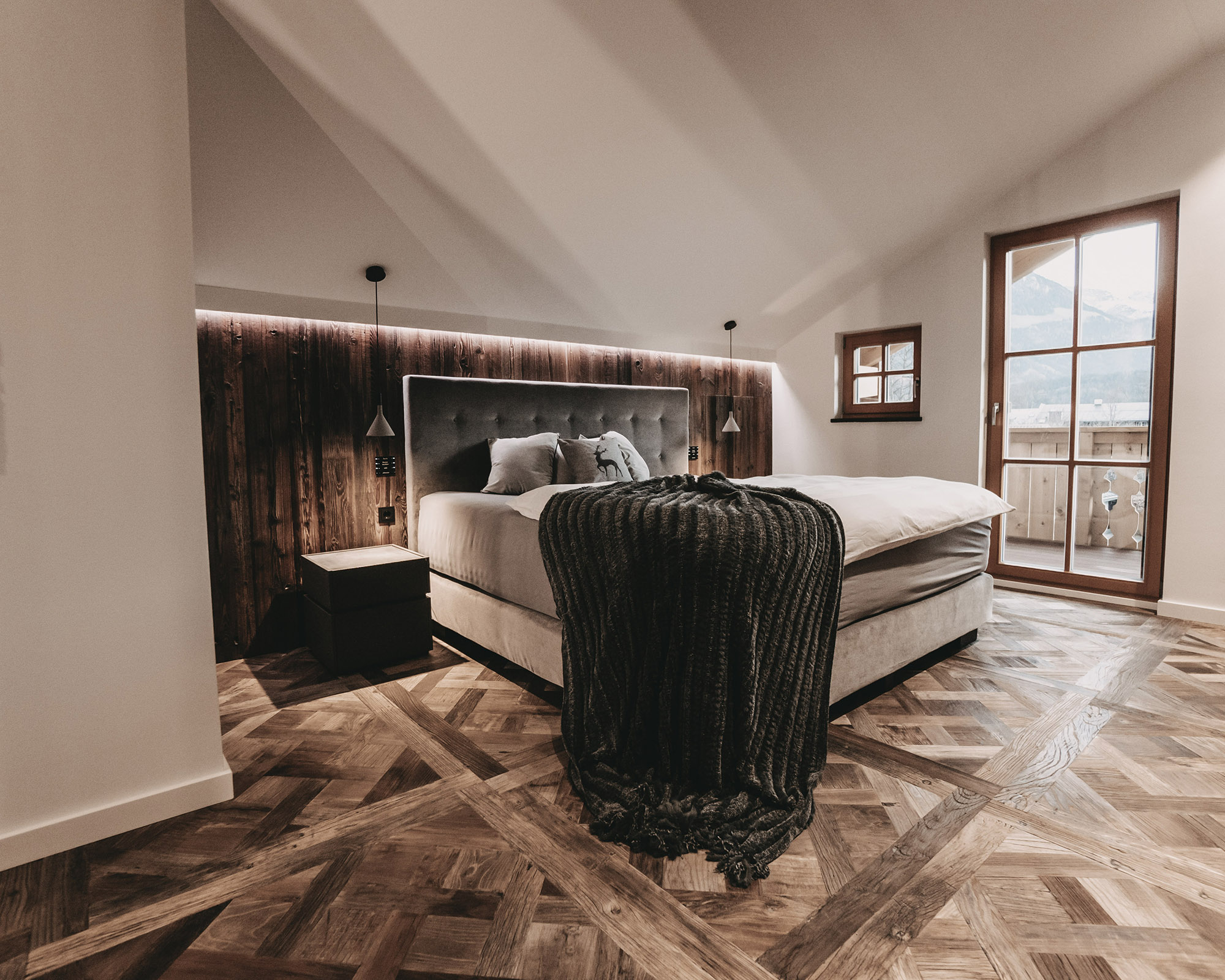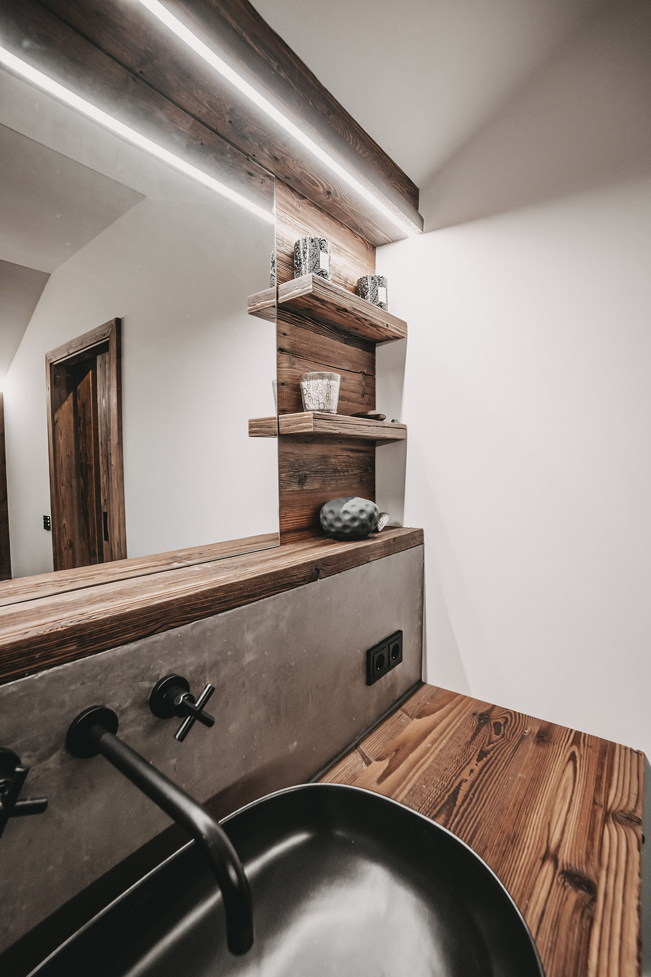 Willkommen in diesem beeindruckenden Penthouse in Berchtesgaden, gestaltet von Michael Sendlhofer von Sendlhofer Design GmbH. Hier vereinen sich traditionelle Elemente mit modernem Design zu einem harmonischen Ganzen. Der warme Parkettboden aus Altholz, die elegante Küche mit Barbereich, und gemütliche Barhocker schaffen eine einladende Atmosphäre. Rustikale Wandverkleidungen, eine moderne Couch von „Arketipo“, und das stimmungsvolle Schlafzimmer mit hinterleuchteter Altholzwand fügen sich nahtlos in das Gesamtkonzept ein. Besonders hervorzuheben sind der stilvolle Esstisch aus Eiche, umgeben von Leder- und Leinenstühlen, sowie der Designer-Lounger „Sinus“ von COR. Dieses Penthouse ist ein wunderschöner Wohnraum, der mit Liebe zum Detail gestaltet wurde und Tradition mit modernem Wohnkomfort verbindet.