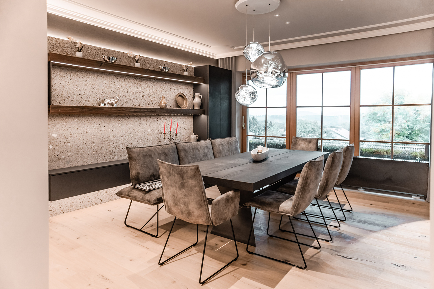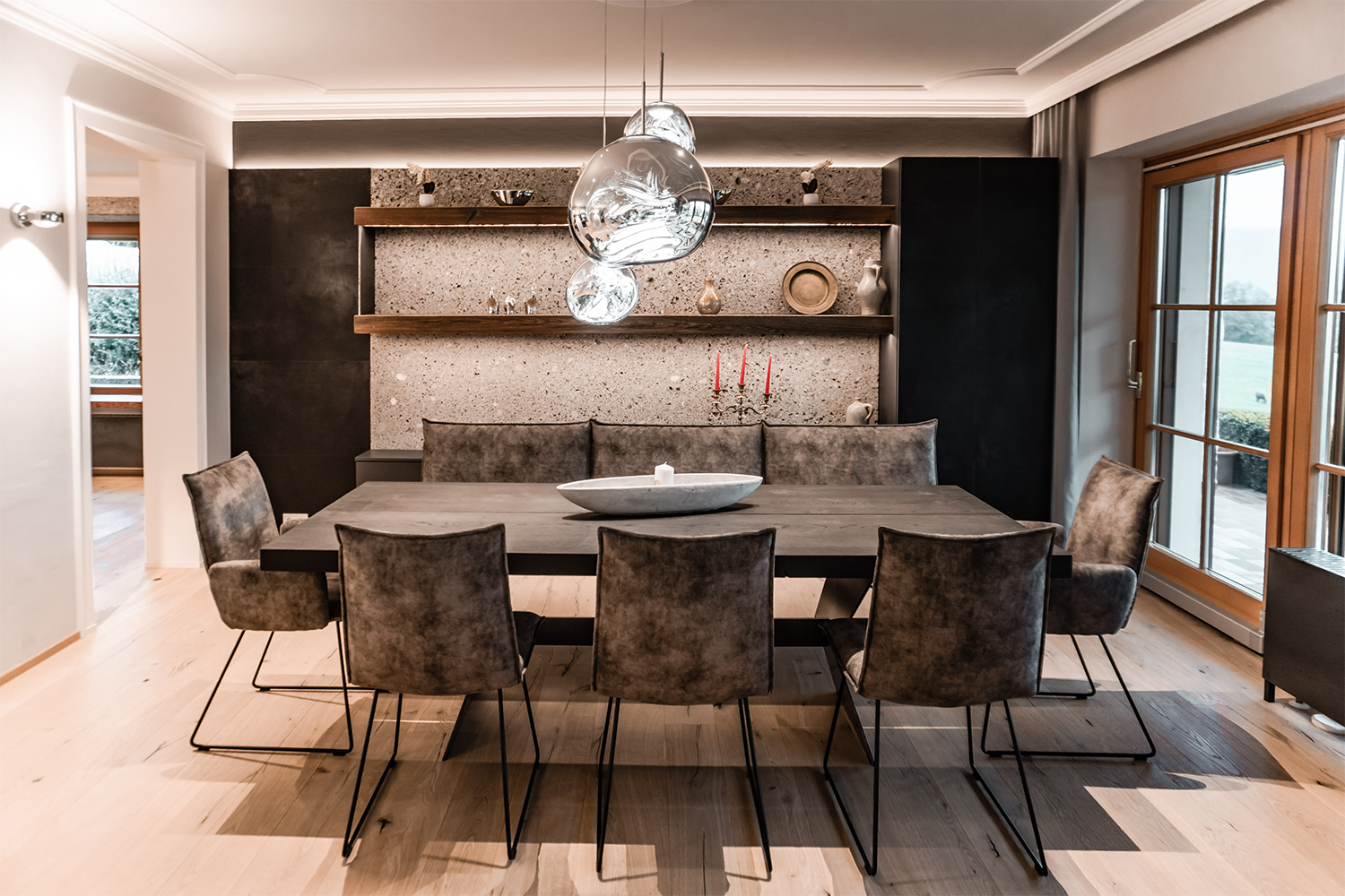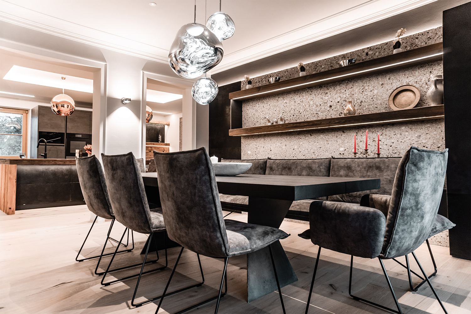 Essplatz mit Konglomeratwand: Der Essplatz im Herzen des Hauses beeindruckt mit einer Konglomeratwand, begleitet von Eichenfächern und indirekter Beleuchtung. Ein massiver Eichentisch mit schwarz gekohlter Oberfläche bietet Platz für Mahlzeiten. Sitzbank und Stühle sind einladend, begleitet von Tom Dixon Pendelleuchten. Die Rohstahl-Heizkörperverkleidung fügt sich perfekt ins Design ein.