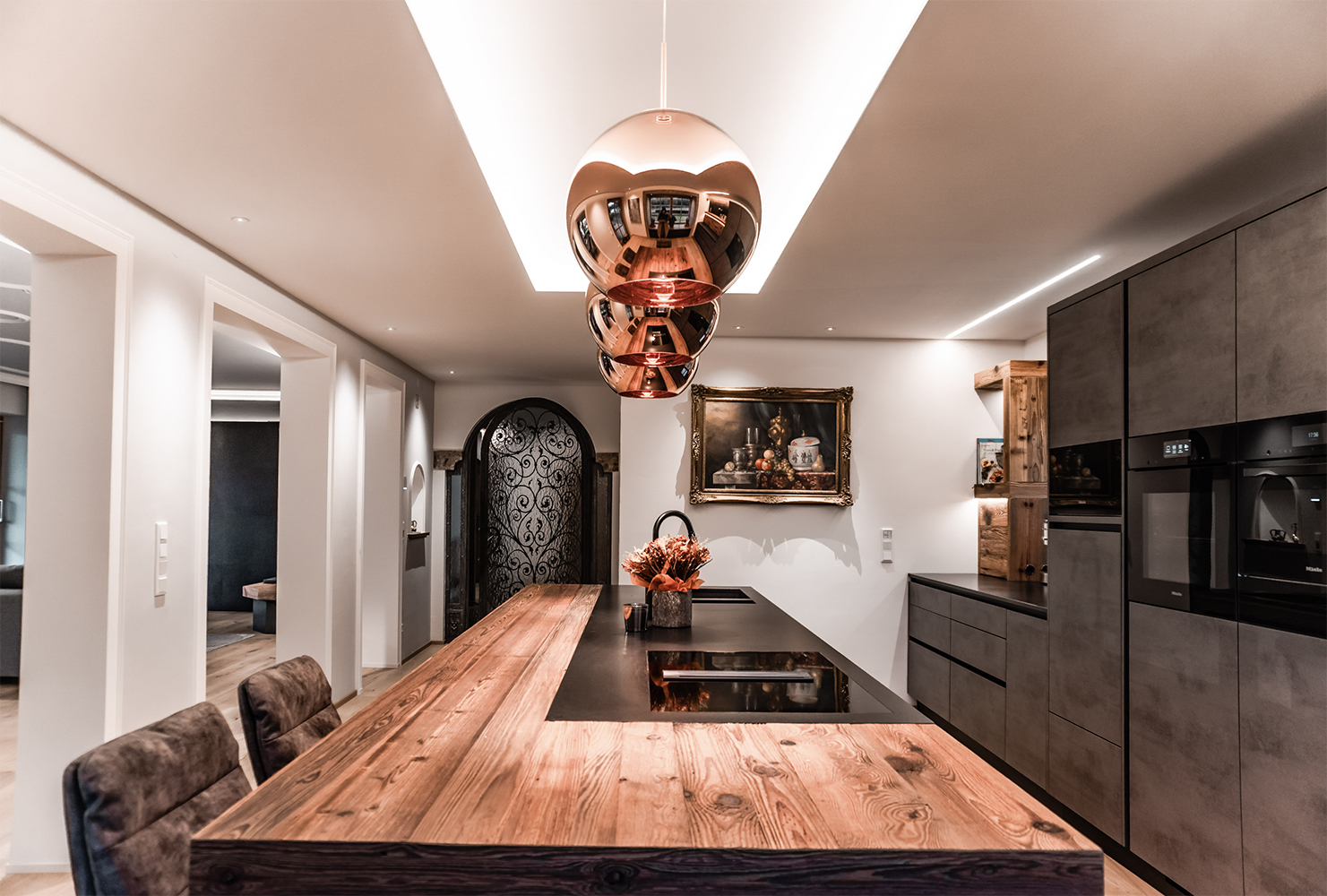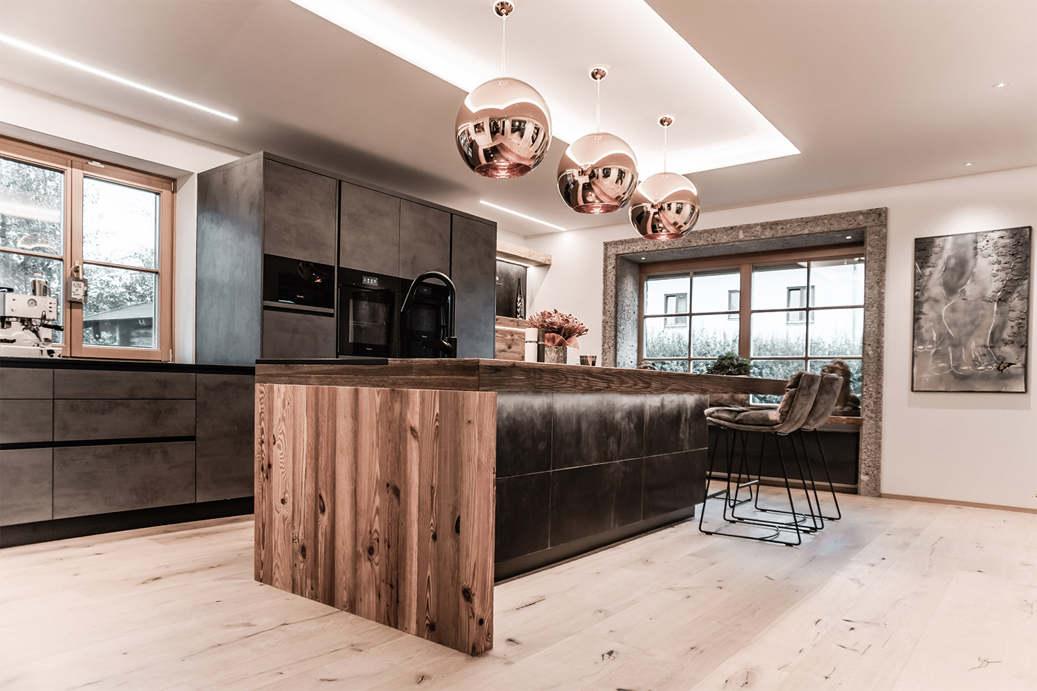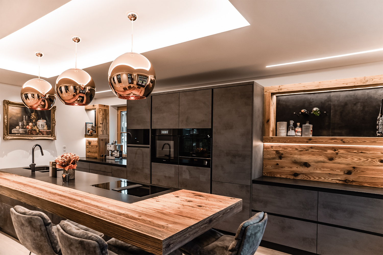 Küche mit Altholz und Leder: Die Küche ist ein Meisterwerk aus Altholz und Leder, perfekt abgestimmt auf die Fronten in Betonoptik. Die Granitarbeitsplatte in Nero Assoluto verleiht der Küche Eleganz. Kupferfarbige Leuchten und indirekte Beleuchtung setzen Akzente bei der Kücheninsel.