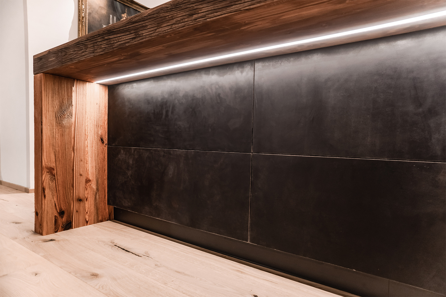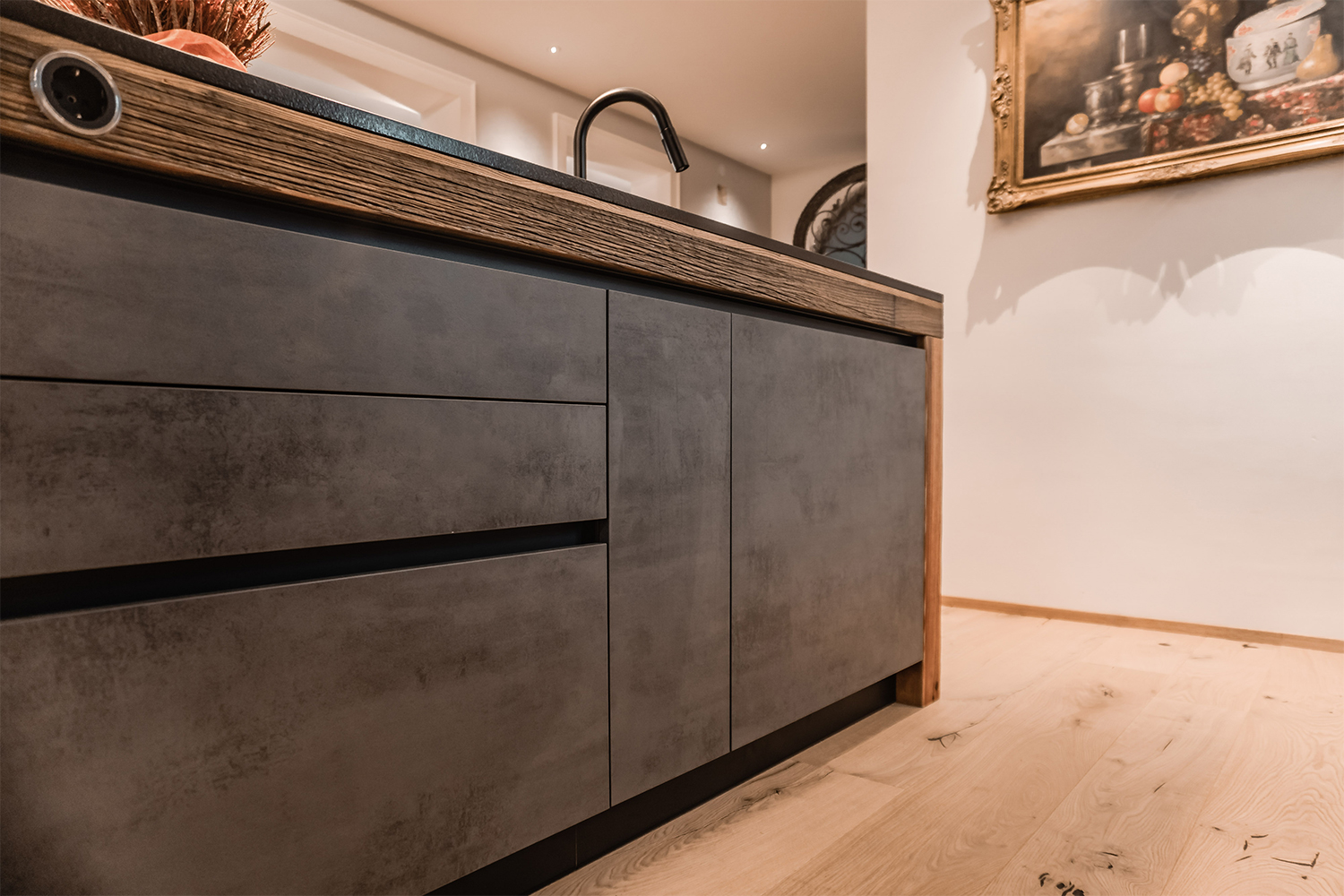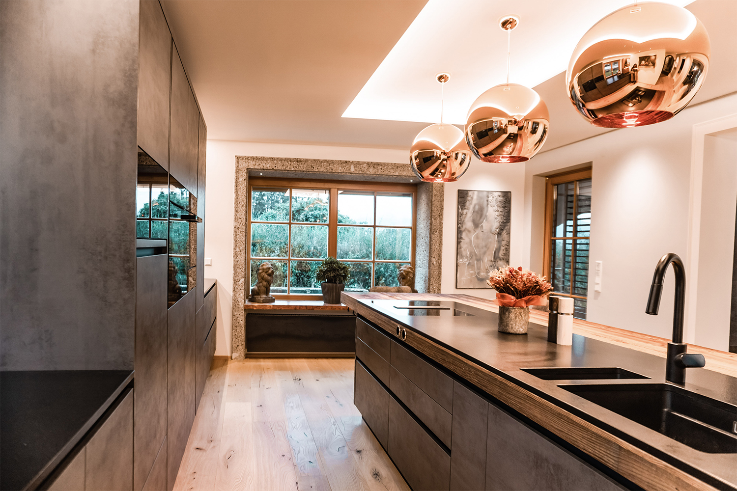 Küche mit Altholz und Leder: Die Küche ist ein Meisterwerk aus Altholz und Leder, perfekt abgestimmt auf die Fronten in Betonoptik. Die Granitarbeitsplatte in Nero Assoluto verleiht der Küche Eleganz. Kupferfarbige Leuchten und indirekte Beleuchtung setzen Akzente bei der Kücheninsel.