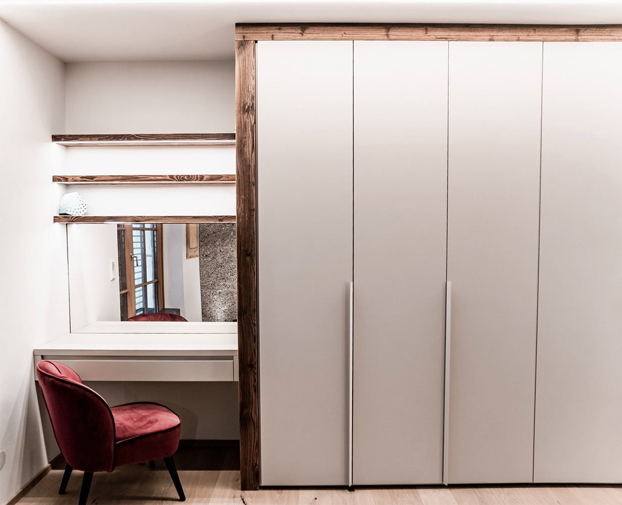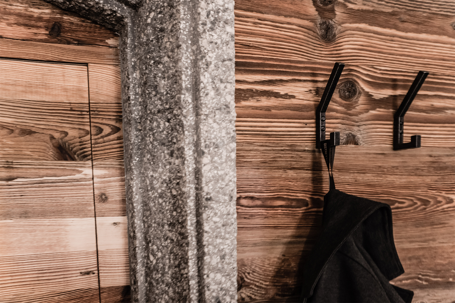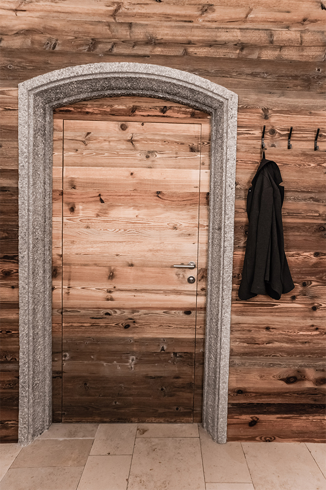 Eingangsbereich mit Holzverkleidungen: Die Holzverkleidungen im Eingangsbereich schaffen einen einladenden ersten Eindruck. Der alte Steinbogen aus Konglomerat mit der integrierten Eingangstüre vervollständigt das Gesamtbild.