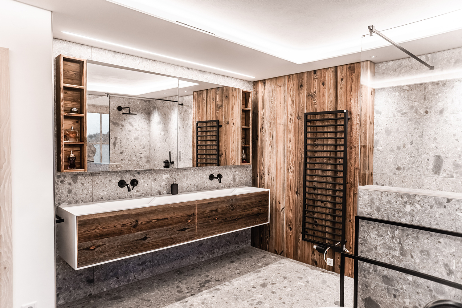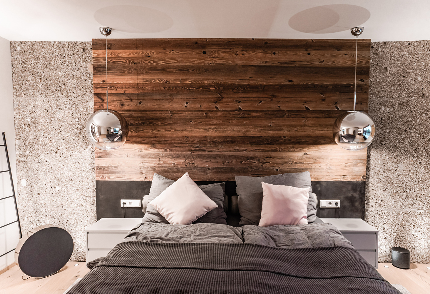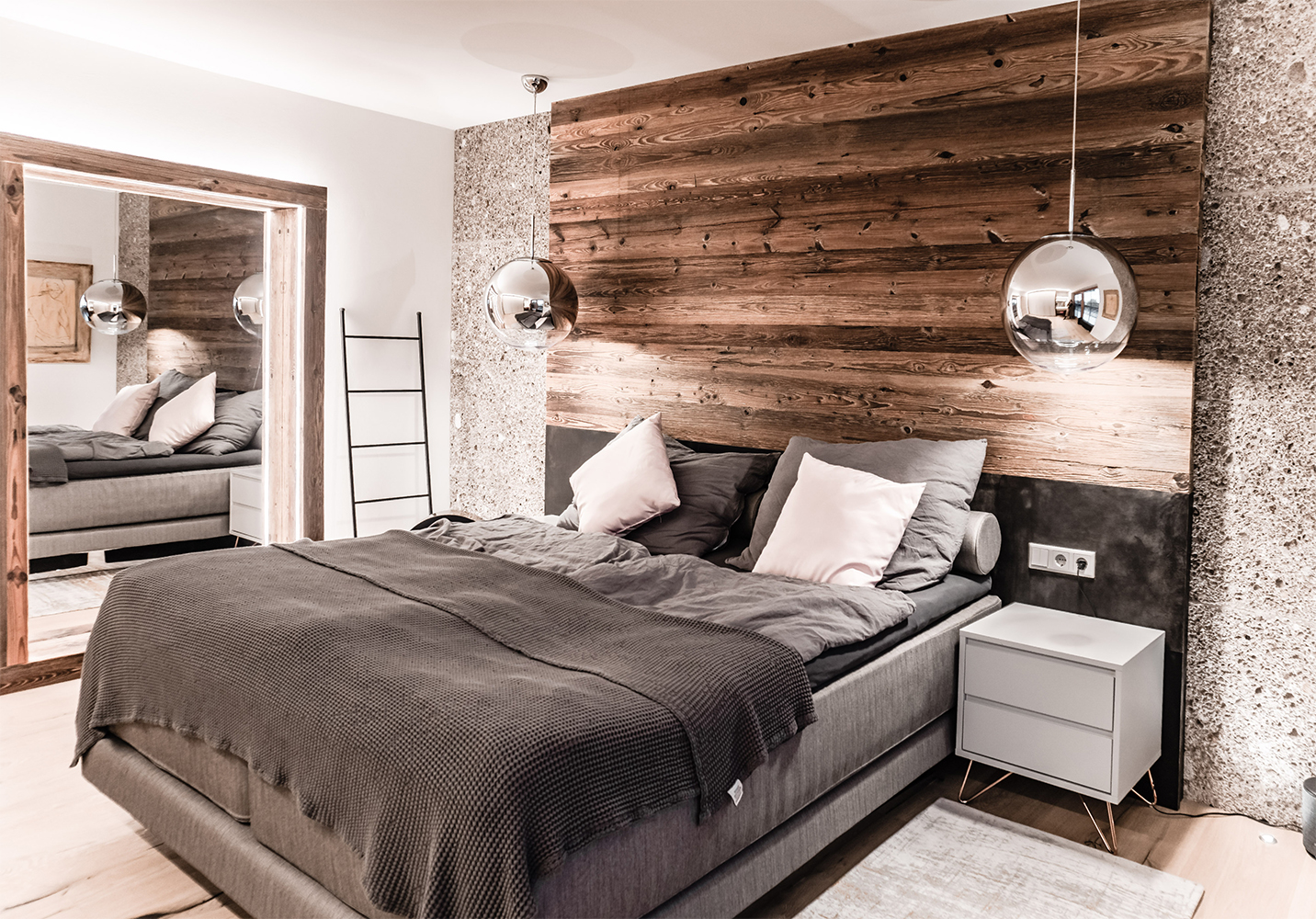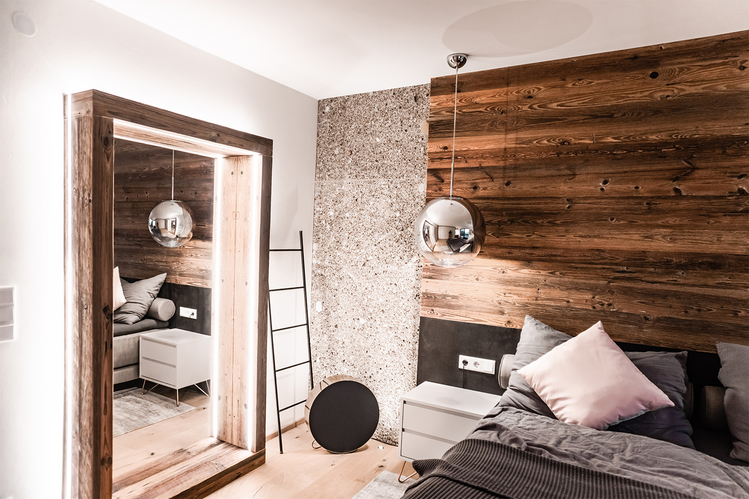 Schlafzimmer mit Wellnessoase: Im Schlafzimmer bildet das Bett mit einer Rückwand aus Leder, Altholz und Konglomerat den Mittelpunkt. Ein großer Spiegel mit Altholzeinrahmung und indirekter Beleuchtung verleiht dem Raum eine einladende Atmosphäre.