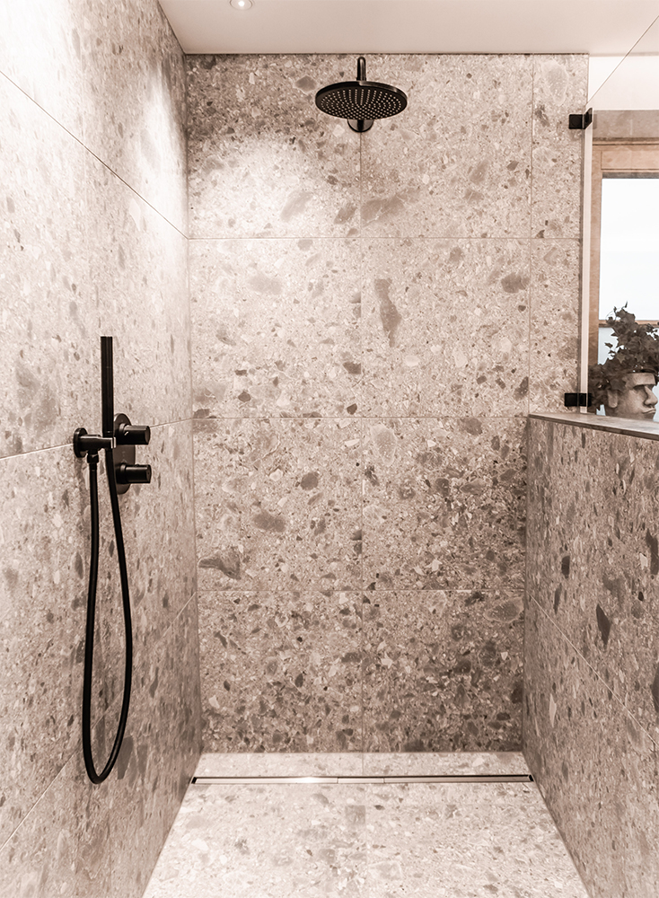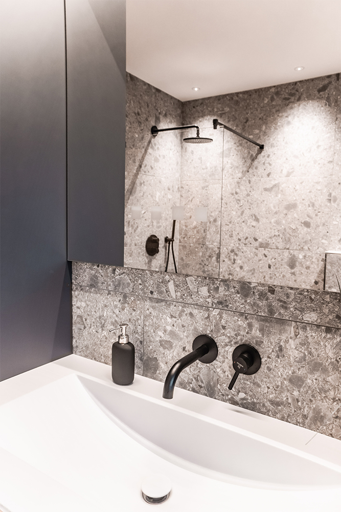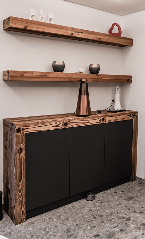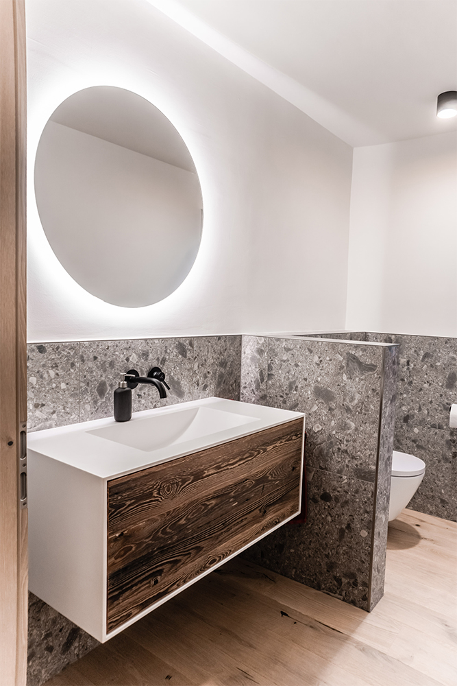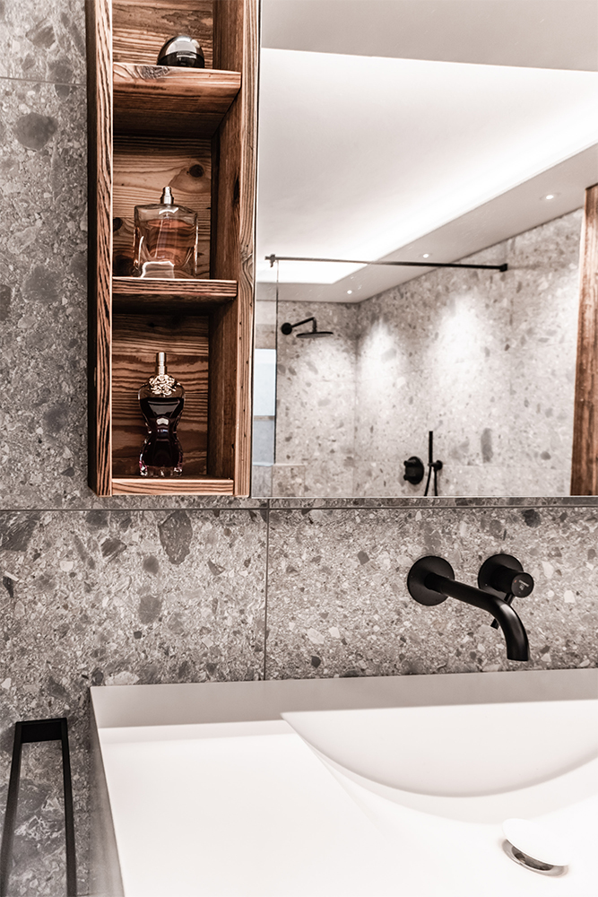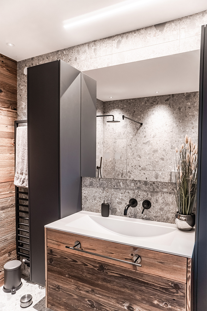 Wellness-Bad und Gästebad: Das Badezimmer ist eine wahre Wellnessoase, gestaltet mit Altholz, Keramikfliesen und schwarzen Armaturen. Der Waschtisch aus Hi-Macs mit Altholzfronten und zwei Waschbecken aus einem Guß sorgen für Funktionalität und Stil. Die schwarze Badewanne rundet das Design ab, das sich auch im Gästebad wiederfindet.