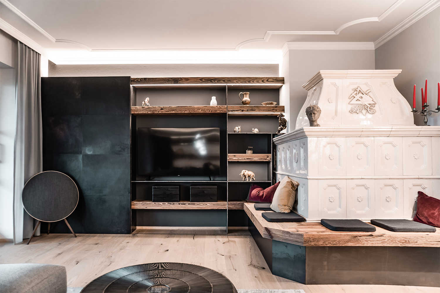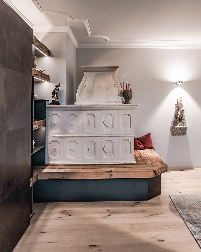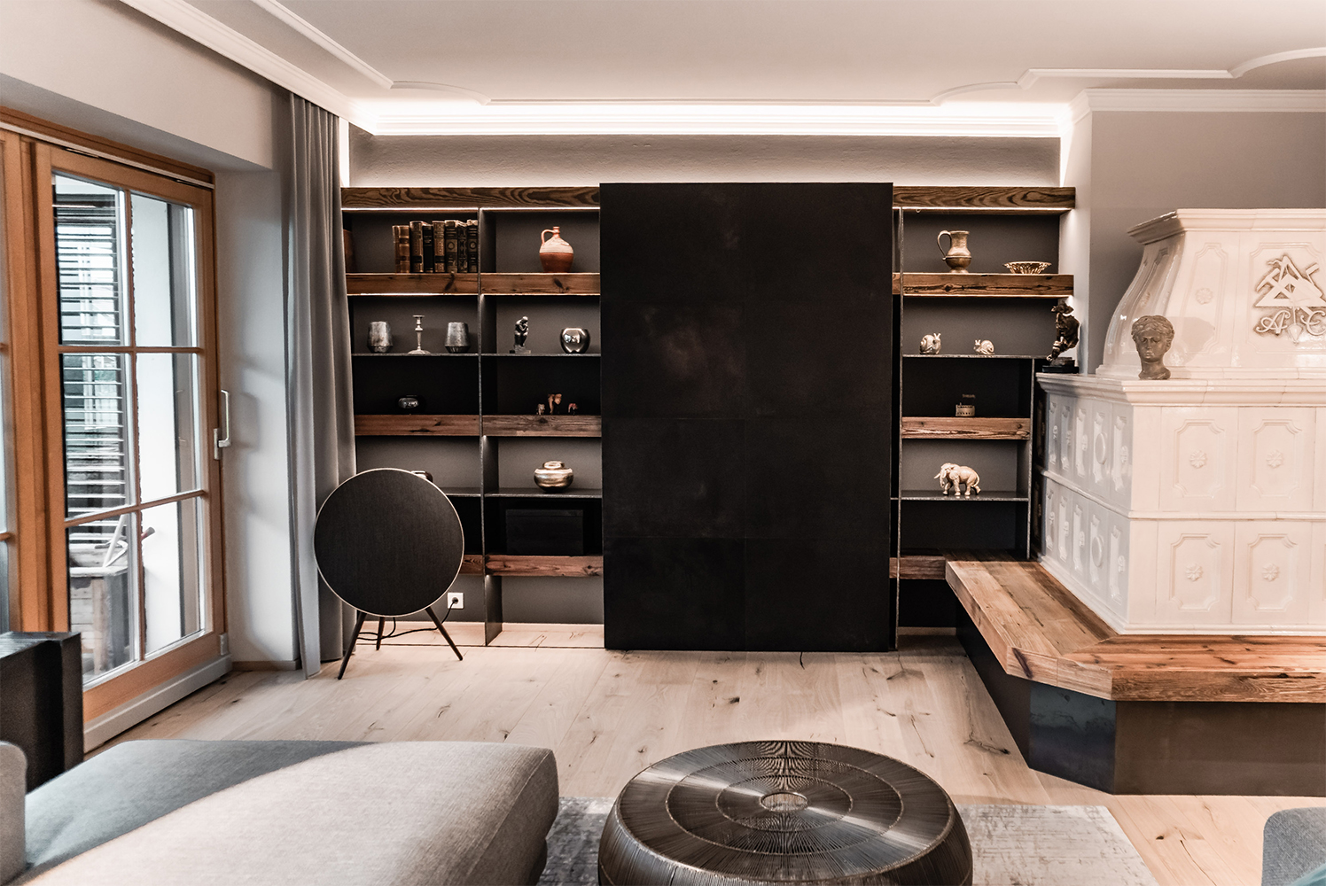 Wohnzimmer mit Kachelofen und Rohstahlschiebetüre: Im Wohnzimmer haben wir den bestehenden Kachelofen ergänzt, der auf einem Rohstahlsockel und einer massiven Eichenplatte thront. Das massive Regal aus Eiche mit Rohstahlschiebetüre bildet einen interessanten Kontrast zum Ofen. Die Couch „Moss“ von Cor lädt zum Entspannen ein.